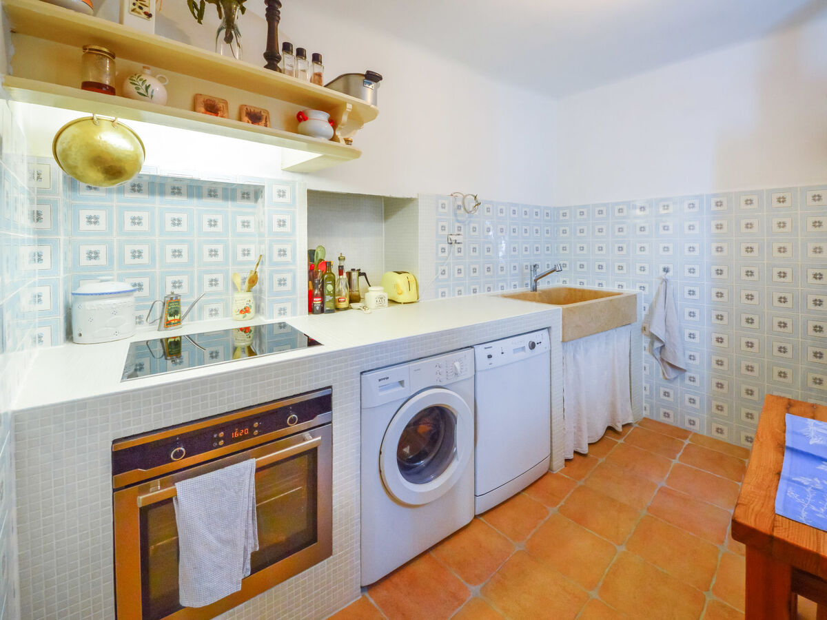 Cuisine ouverte (four, lave-vaisselle, 4 plaques vitrocéramiques, micro-ondes, congélateur, cafetière électrique).