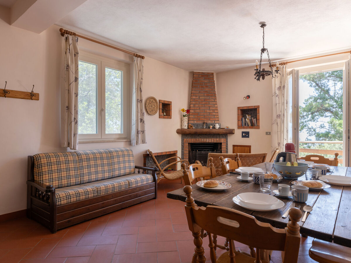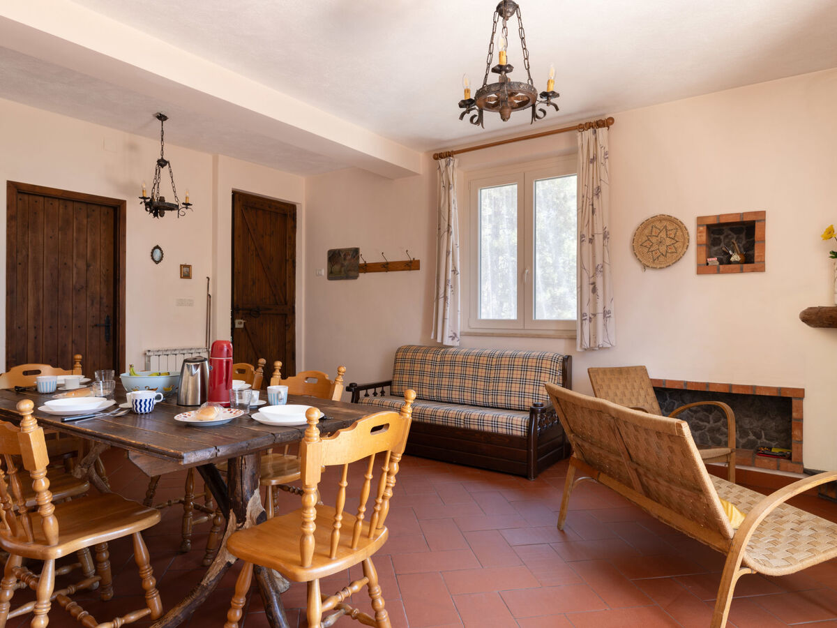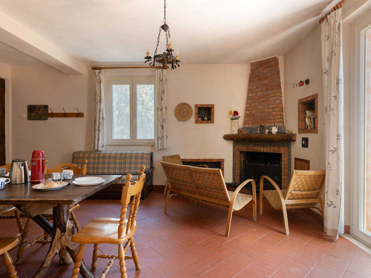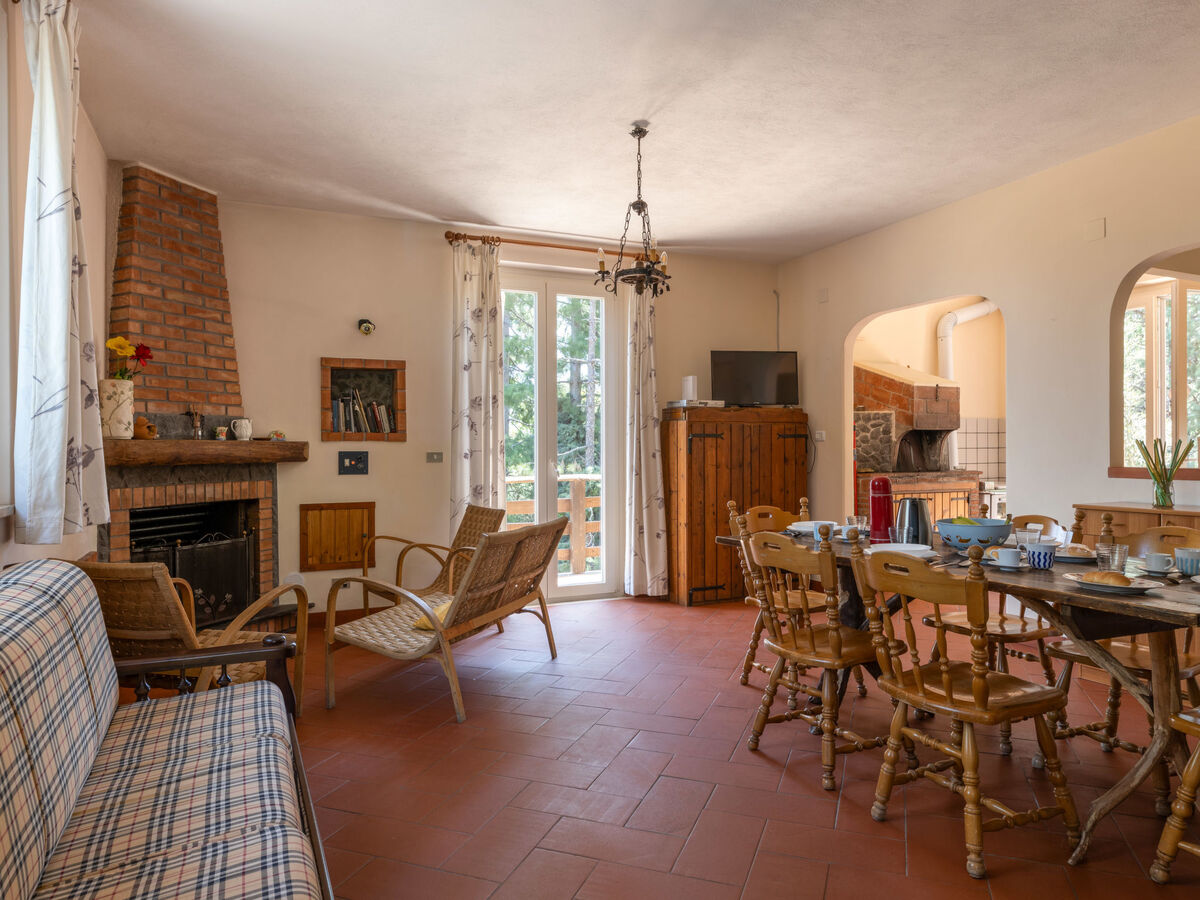 Aménagement confortable et rustique: séjour/salle à manger avec cheminée et TV (satellite) (écran plat).