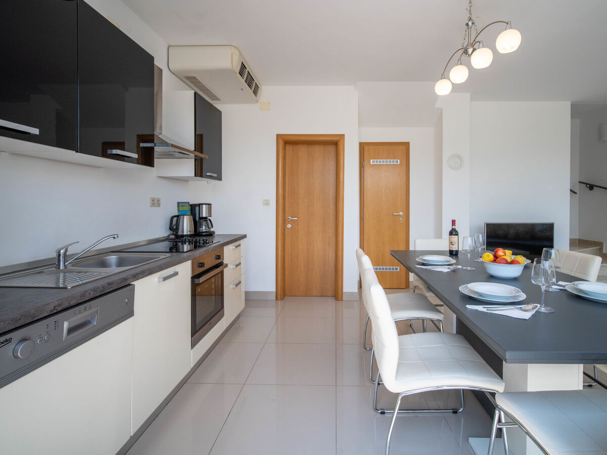 Cuisine ouverte (four, lave-vaisselle, 4 plaques vitrocéramiques, congélateur, cafetière électrique).