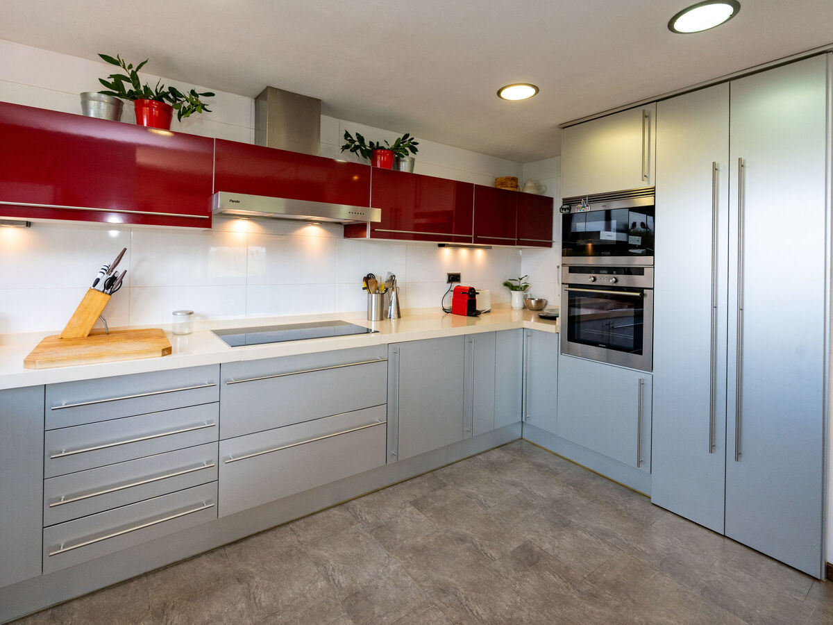 Cuisine (four, lave-vaisselle, 4 plaques vitrocéramiques, micro-ondes, congélateur, cafetière électrique) avec table pour les repas.