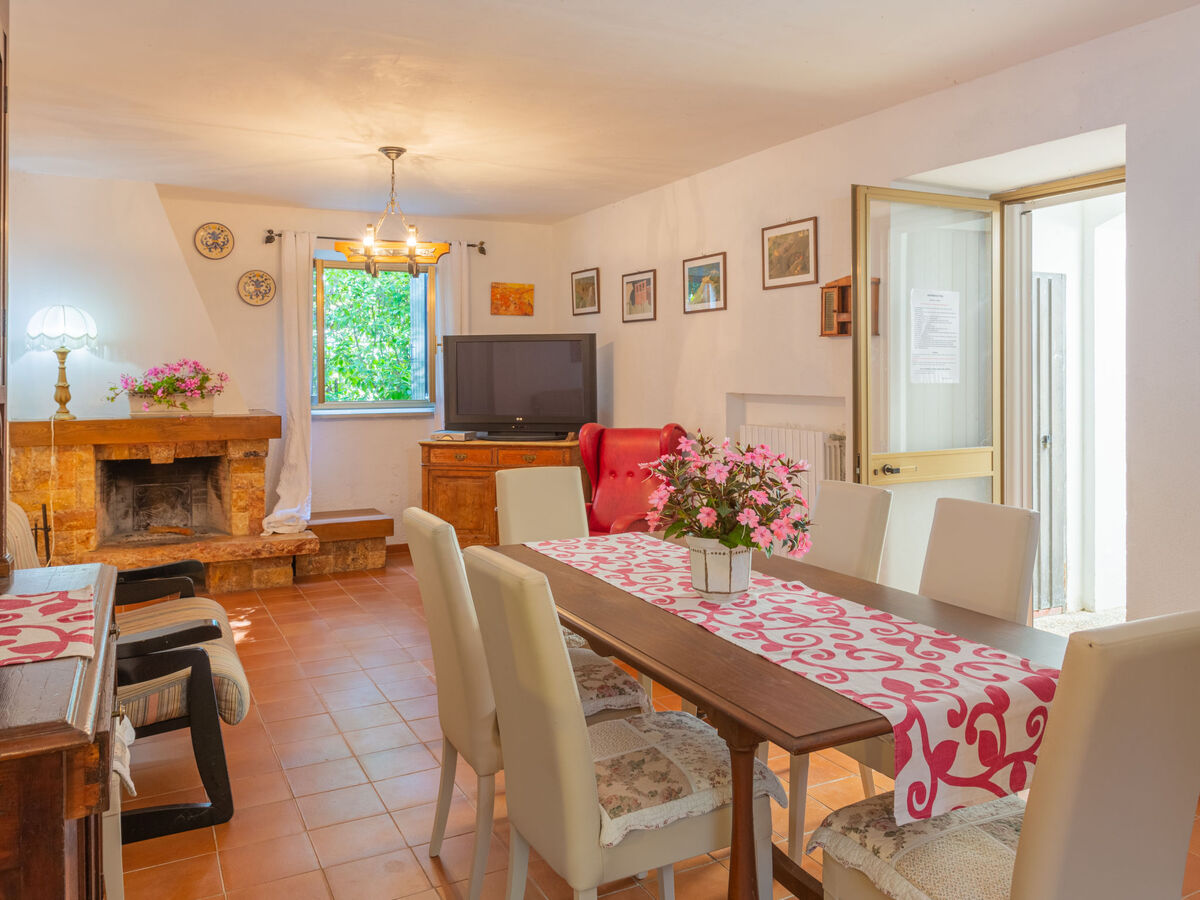 Aménagement rustique: séjour/salle à manger avec cheminée, table pour les repas et TV.