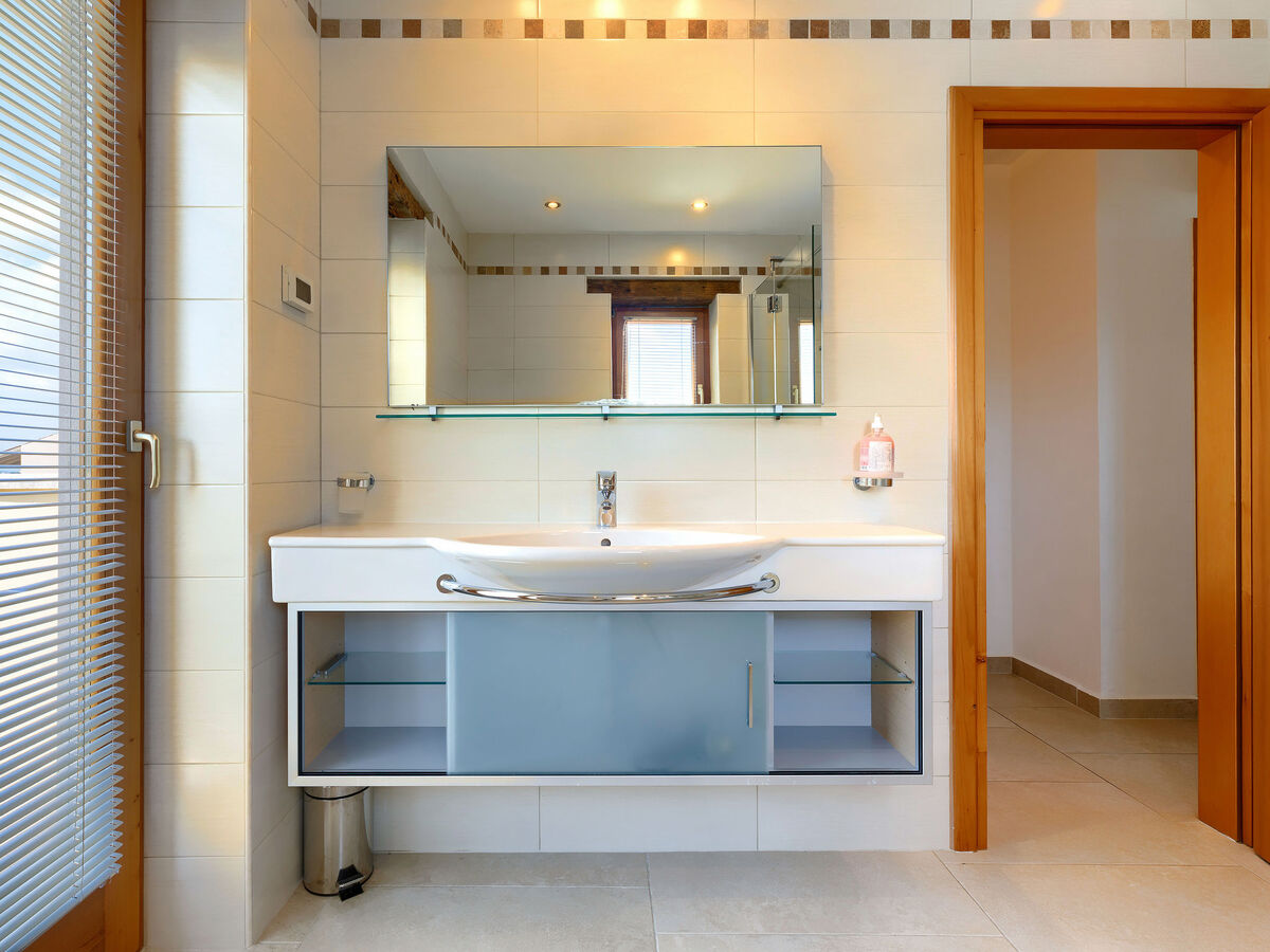 À l'étage supérieur: 1 chambre avec 1 grand-lit (160 cm, longueur 200 cm), douche/bidet/WC et air-conditionné.