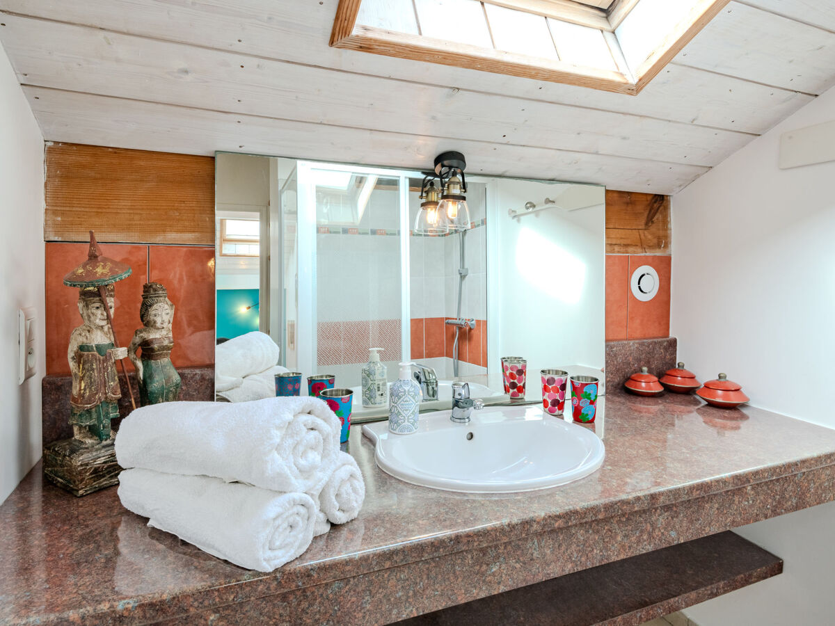 1 chambre, mansardée avec 2 lits (90 cm, longueur 190 cm), lavabo, douche et air-conditionné.
