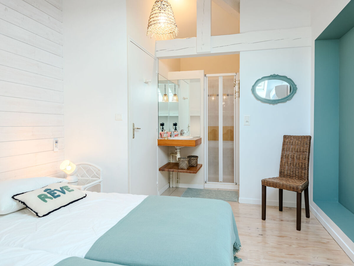 1 chambre avec 1 grand-lit (160 cm, longueur 200 cm), douche/WC.