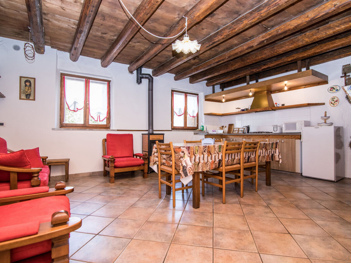 Aménagement rustique et plaisant: séjour/salle à manger avec poêle suédois, table pour les repas, coin-cuisine et TV.