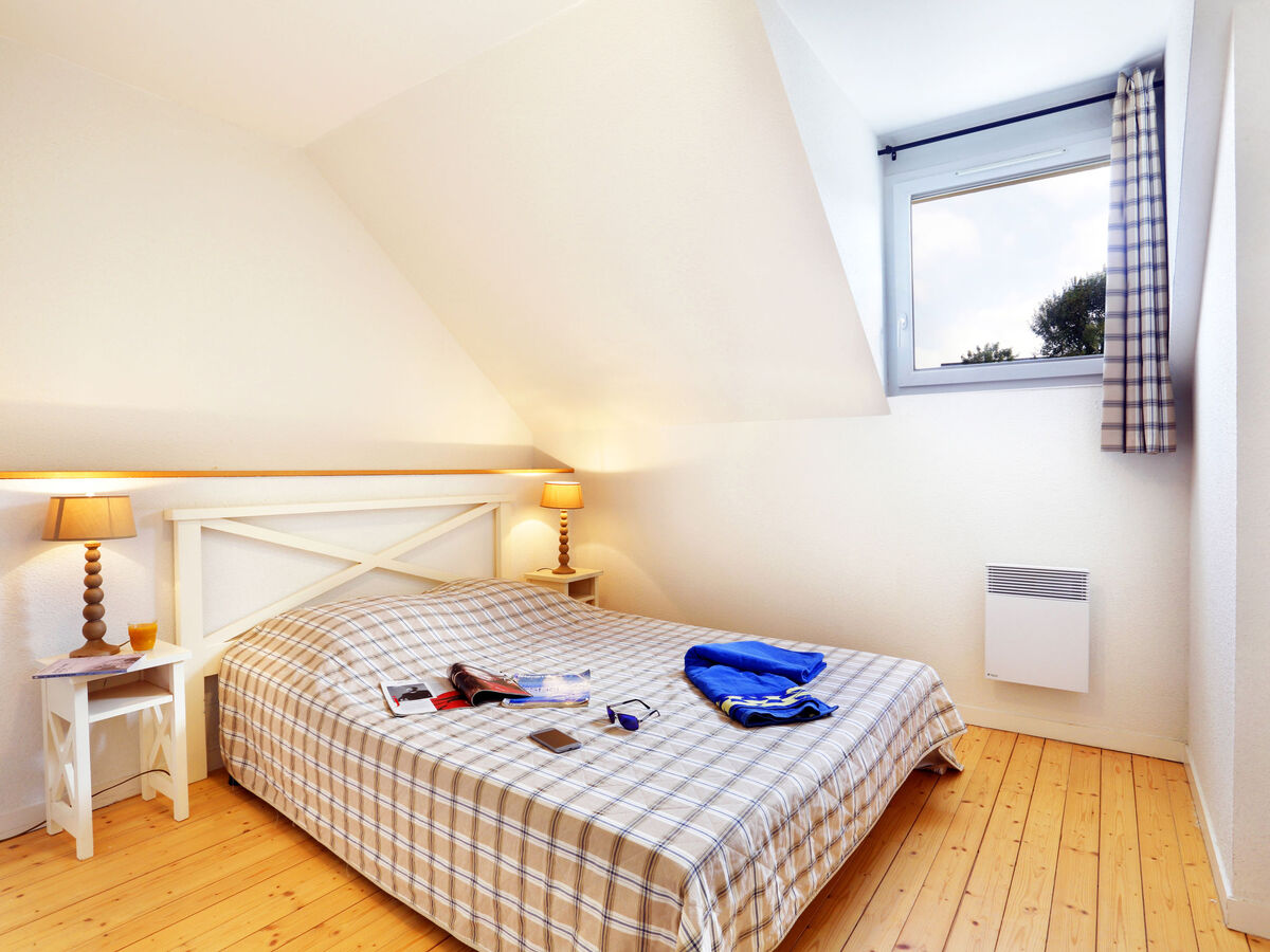 À l'étage supérieur: 1 chambre, mansardée avec 1 grand-lit (140 cm, longueur 190 cm).