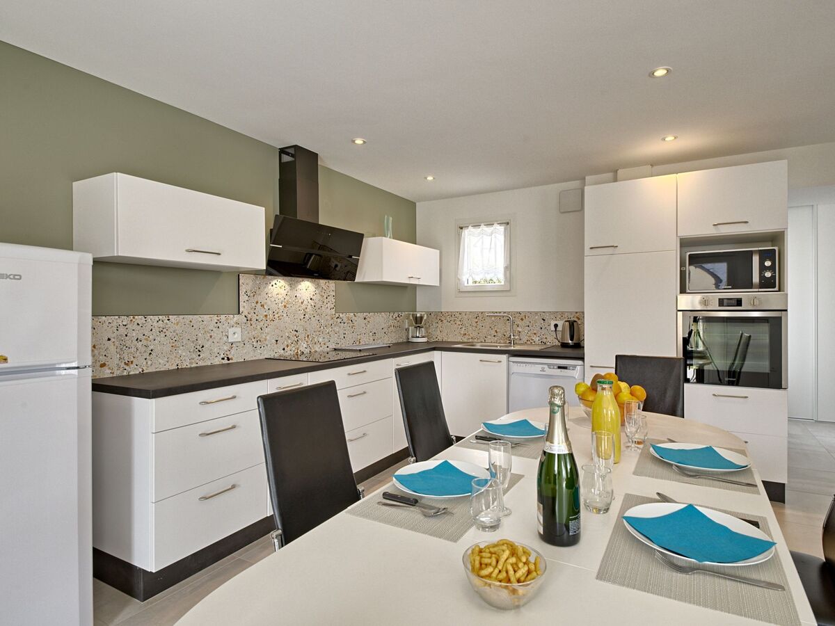 Cuisine ouverte (four, lave-vaisselle, 3 plaques à induction, grille-pain, bouilloire électrique, micro-ondes, cafetière électrique).