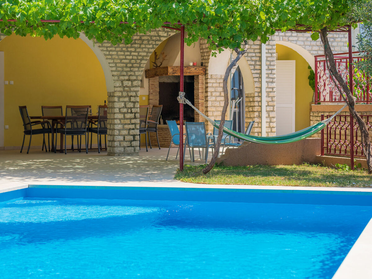 A usage privé: terrain 400 m2 (clôturé) avec pelouse et arbres, piscine rectangulaire (8 x 4 m, profondeur 135 - 135 cm, disponibilité saisonnière: 01.Mai.