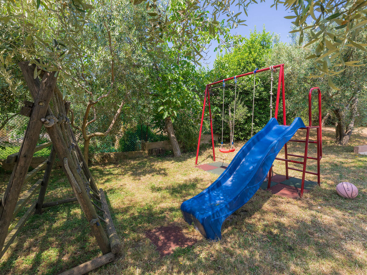 Douche extérieure, terrasse (15 m2), meubles de jardin (toboggan, balançoire).