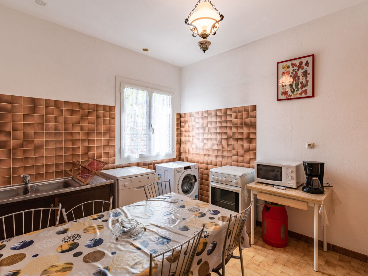 Cuisine/séjour (four, lave-vaisselle, 4 feux, micro-ondes, congélateur, cafetière électrique) avec table pour les repas.