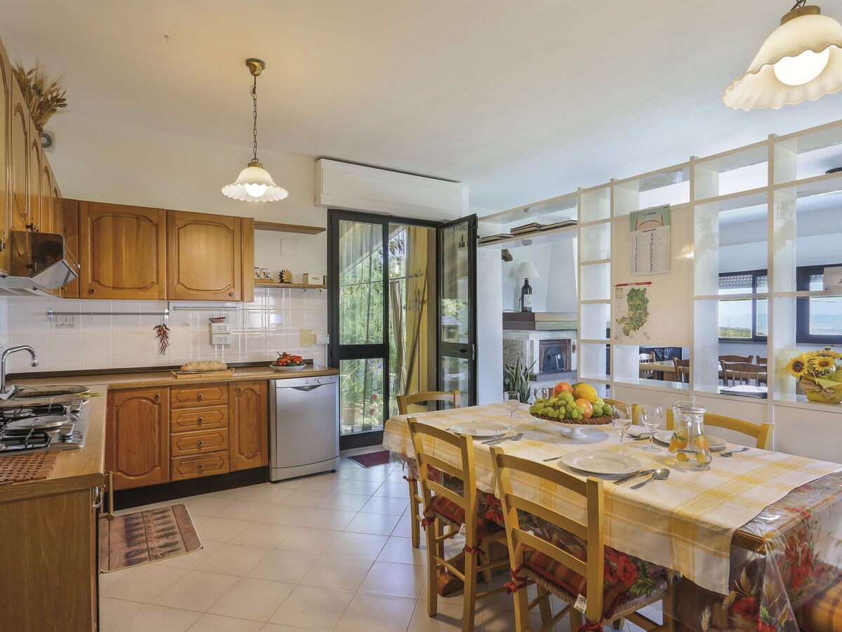 Cuisine (four, lave-vaisselle, 4 feux, grille-pain, bouilloire électrique, micro-ondes, cafetière électrique) avec table pour les repas.