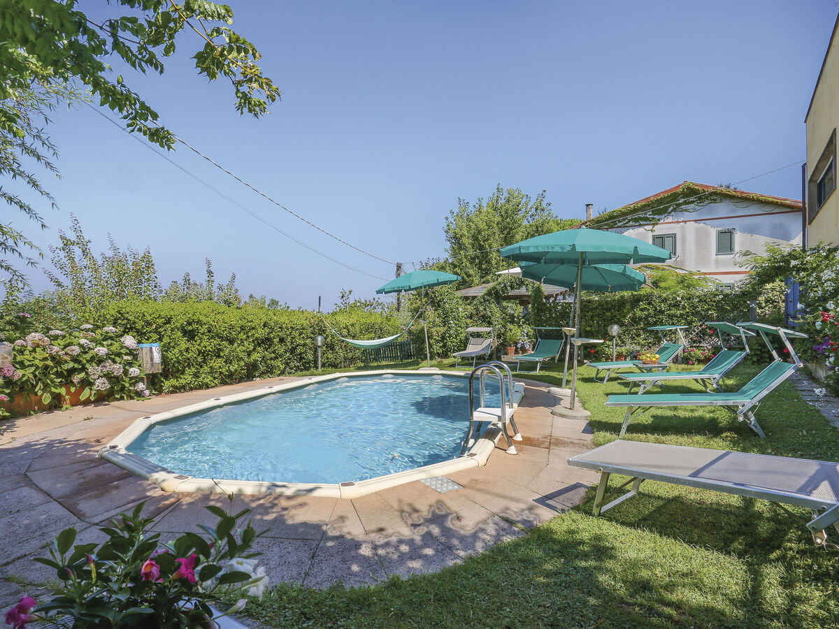 A usage privé: terrain, jardin sur plusieurs niveaux avec pelouse et plantes, piscine (7 x 4 m, profondeur 140 cm, disponibilité saisonnière: 03.Avr.