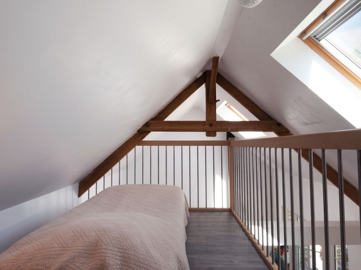 Sous le toit: (escalier raide) galerie mansardée, ouverte avec 1 lit.