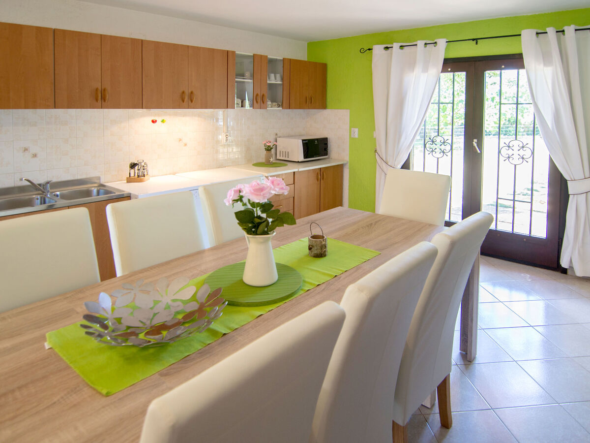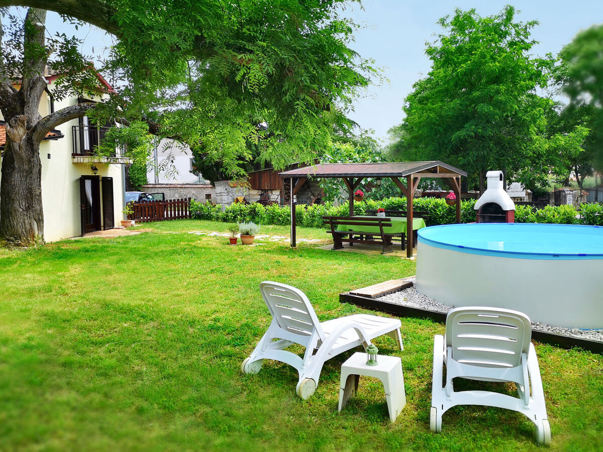 A usage privé: terrain 700 m2 (clôturé), jardin avec pelouse et arbres, piscine (hors sol) ronde (3.5 m diamètre, profondeur 90 cm, disponibilité saisonnière: 15.Mai.