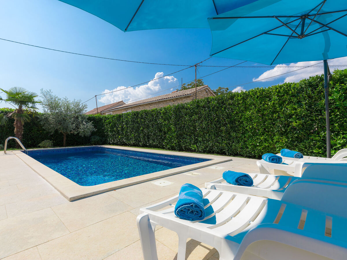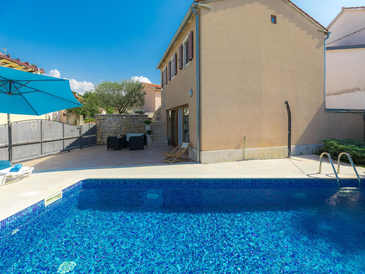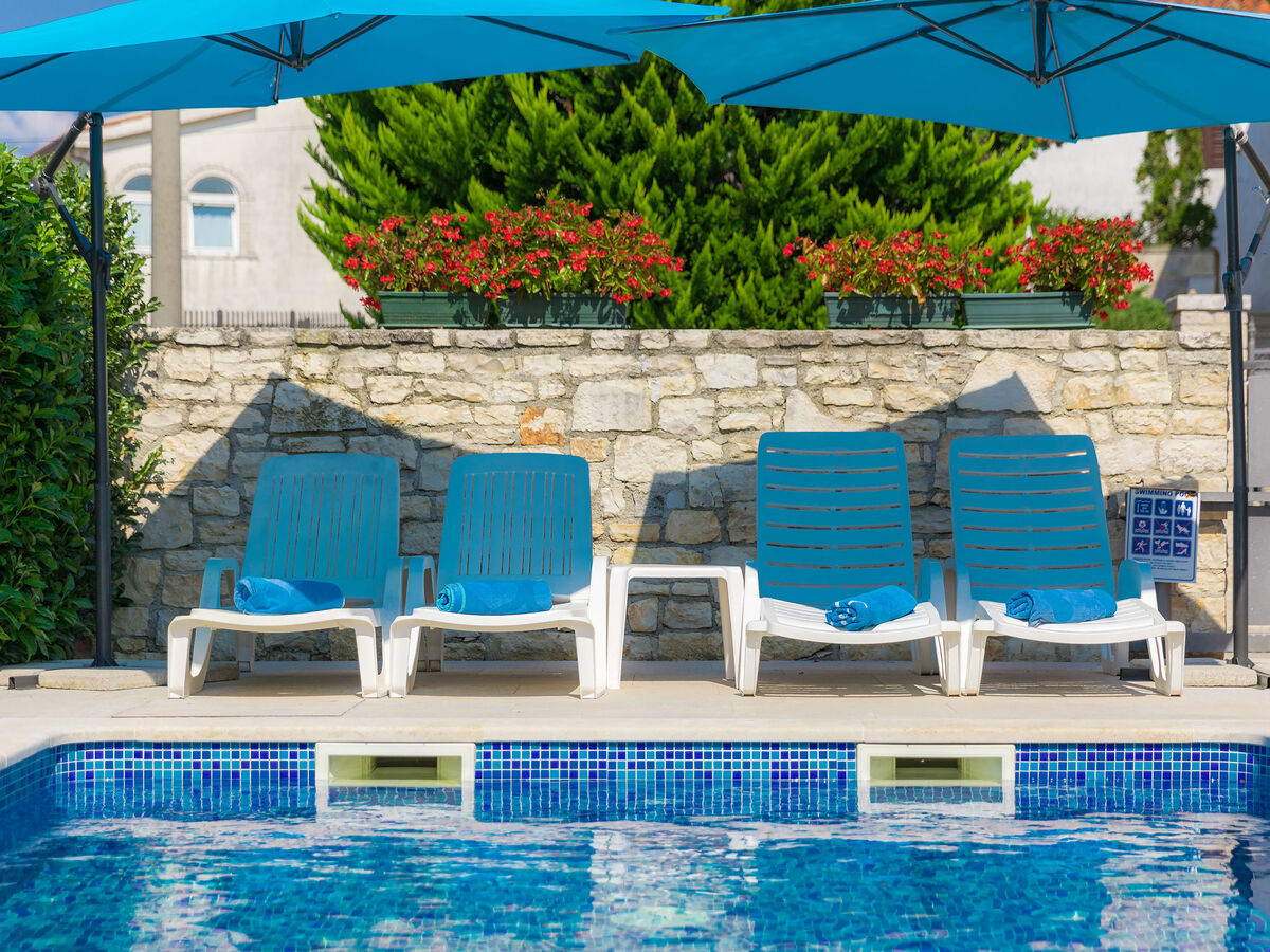 A usage privé: terrain 200 m2 (clôturé), piscine rectangulaire (7 x 3 m, 23 m2, profondeur 130 cm, disponibilité saisonnière: 01.Mai.