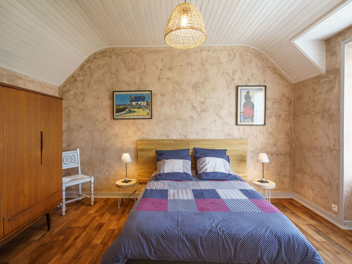 À l'étage supérieur: 1 chambre avec 1 grand-lit (140 cm, longueur 190 cm).