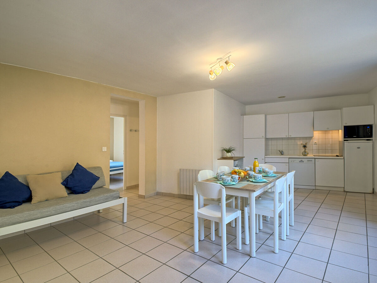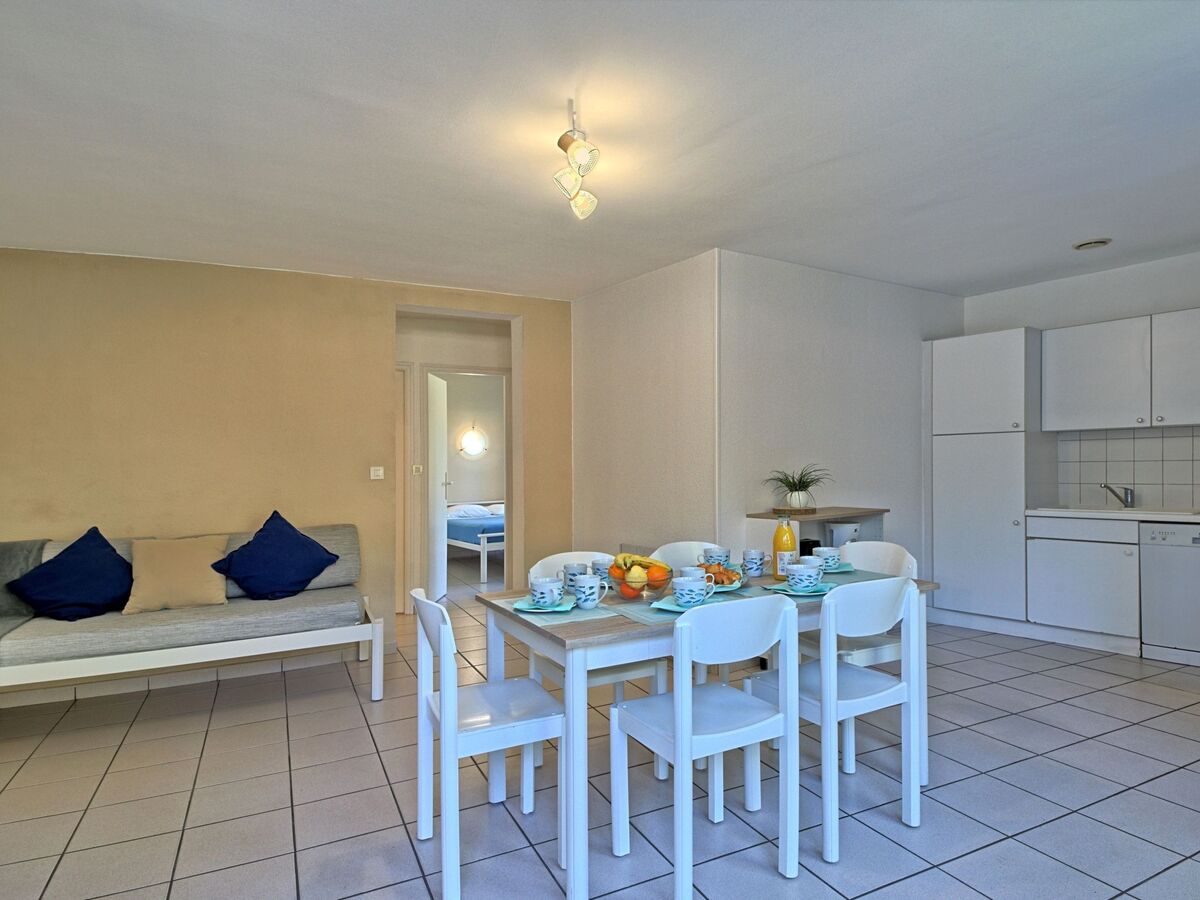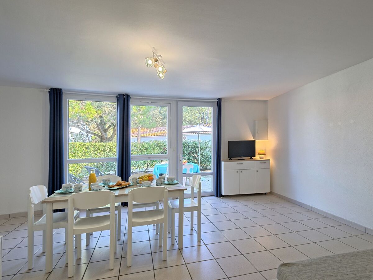 Rénovée en 2024, aménagement fonctionnel: séjour/salle à manger avec 1 divan-lit (90 cm, longueur 190 cm), table pour les repas, TV et chaînes de TV internationales.