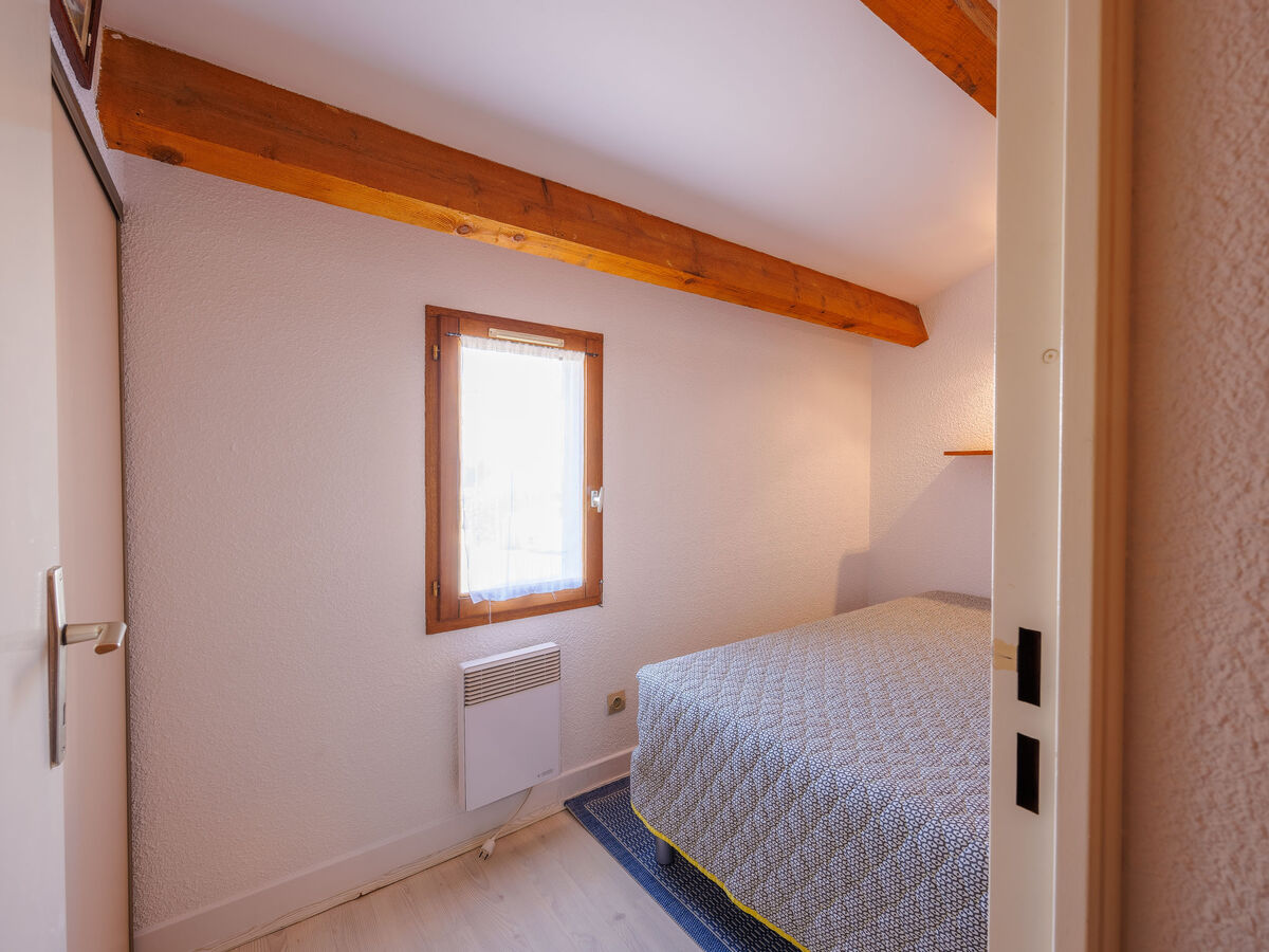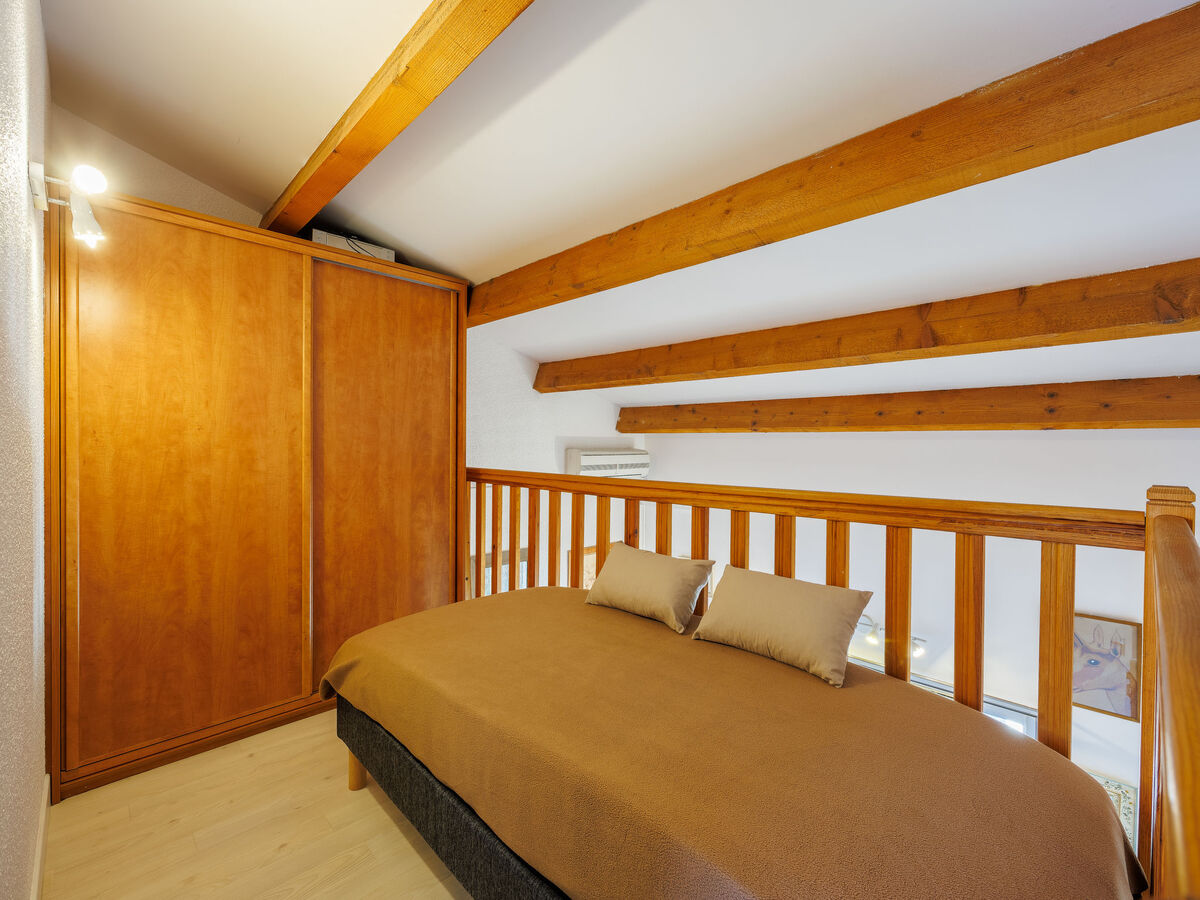 À l'étage supérieur: 1 chambre, mansardée avec 1 grand-lit (140 cm, longueur 190 cm).