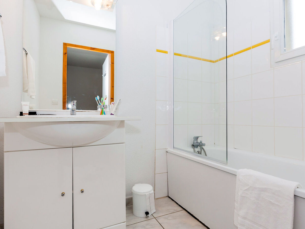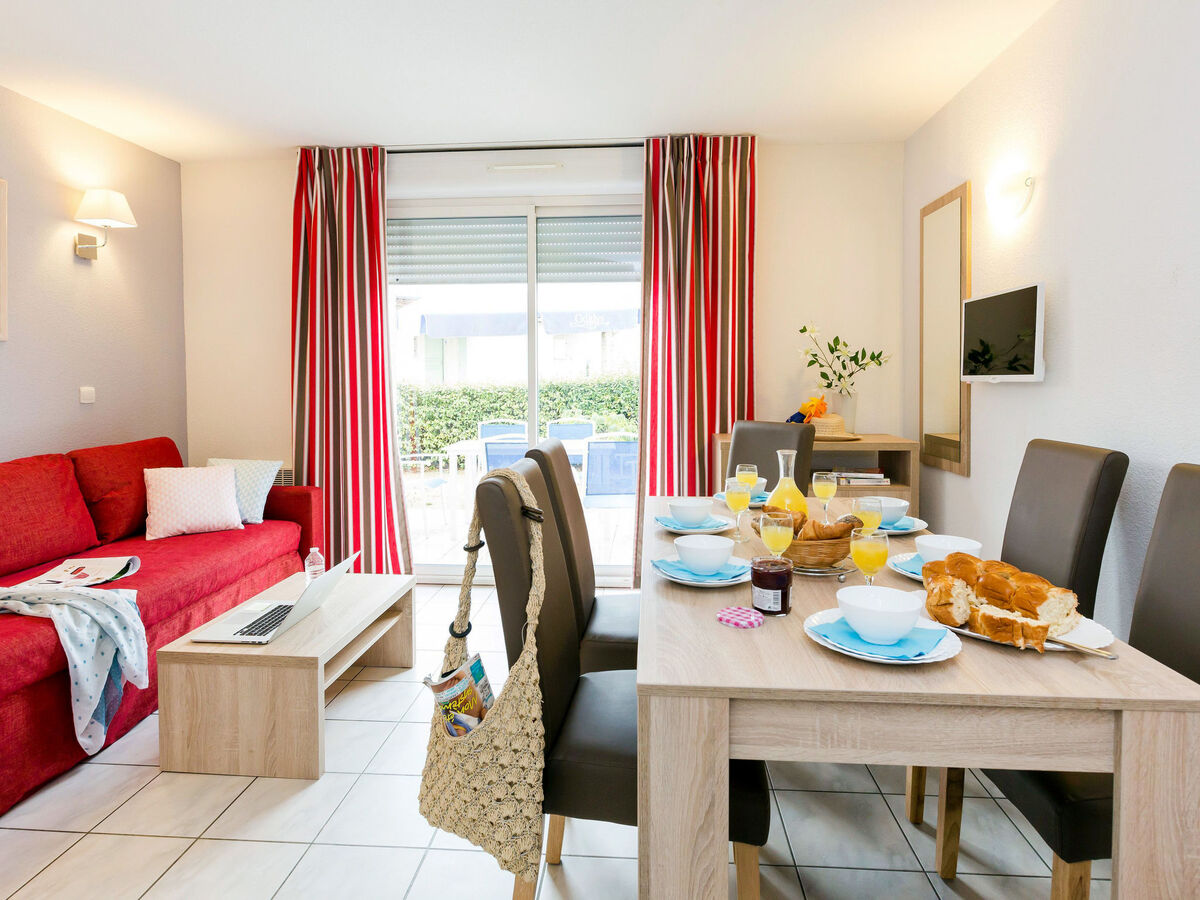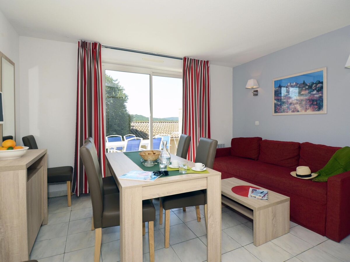 Clair, aménagement fonctionnel: séjour/chambre à coucher avec 1 divans-lits, 1 lits gigognes, table pour les repas et TV.