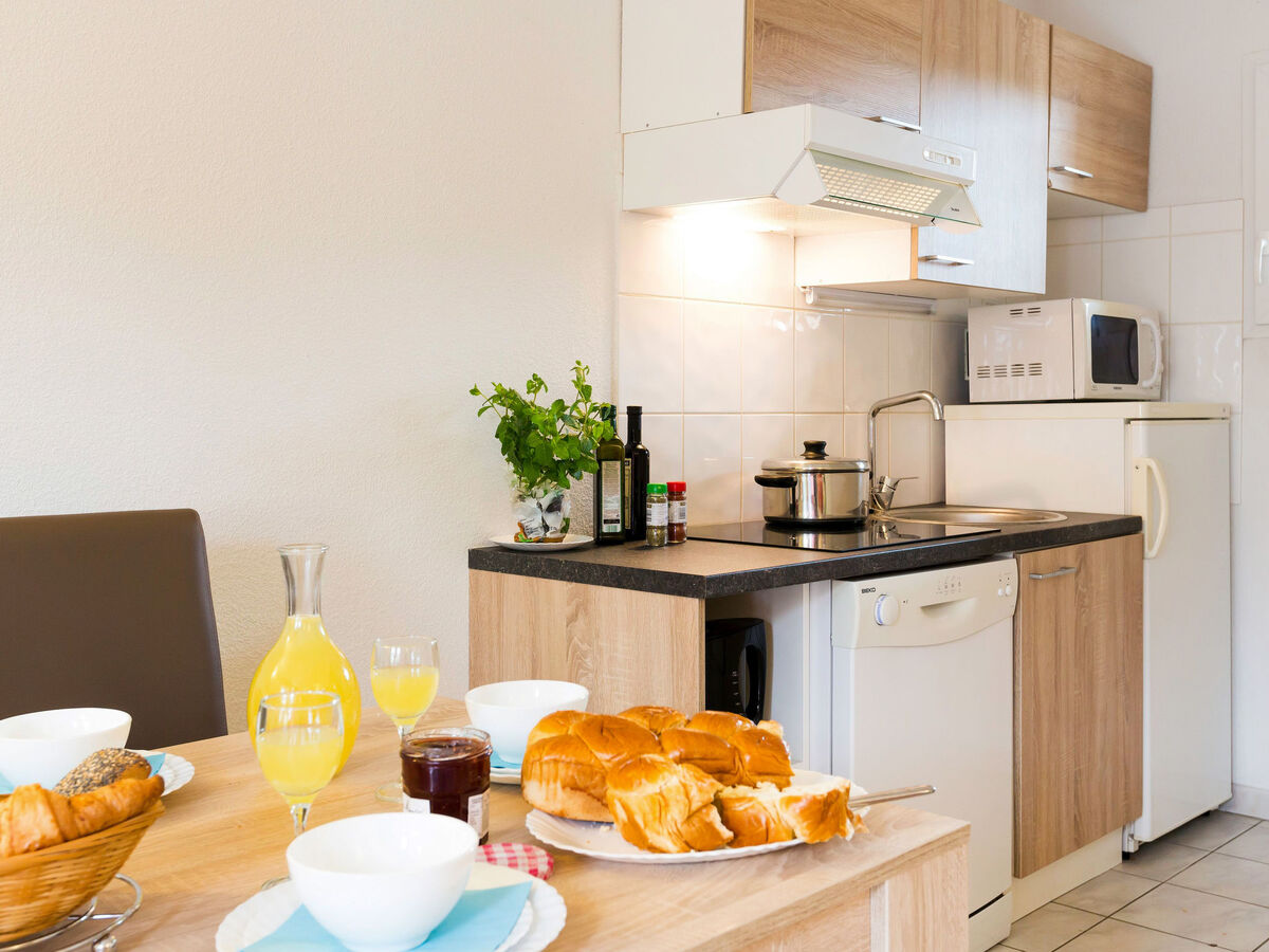 Coin cuisine (4 plaques de cuisson, lave-vaisselle, micro-ondes, cafetière électrique).