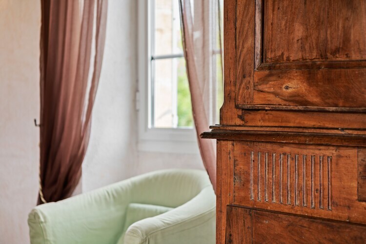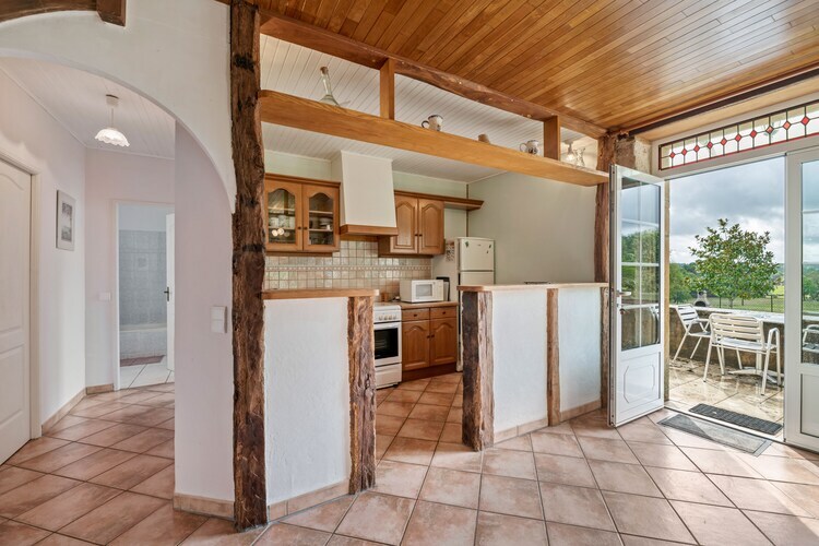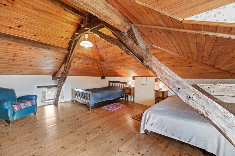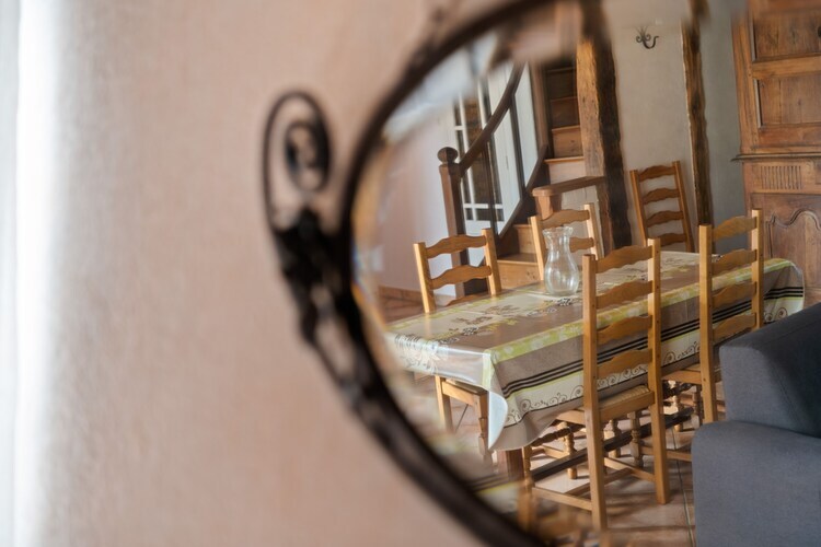Accès par un escalier en pierre et une petite terrasse, l'intérieur allie boiseries et meubles anciens, créant une ambiance chaleureuse et rustique. La maison comprend une cuisine bien équipée, des espaces de vie confortables et des attentions particulières pour les enfants, comme un lit bébé et une chaise haute.