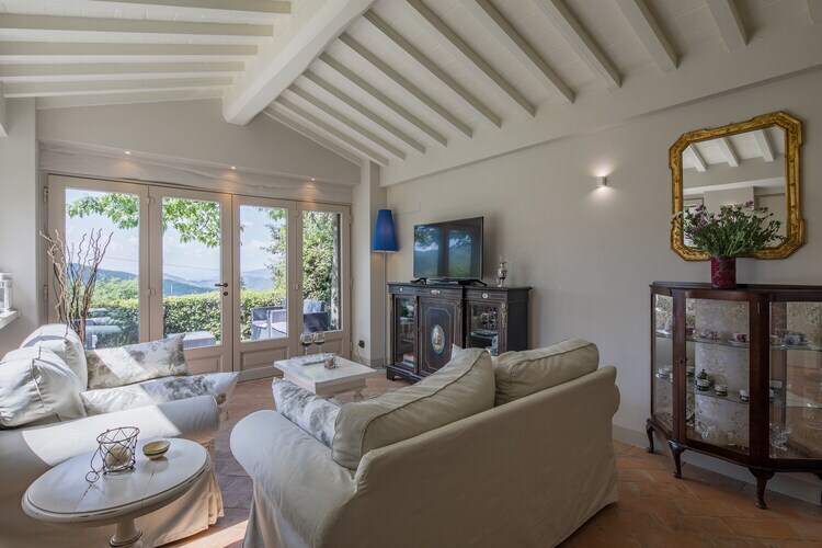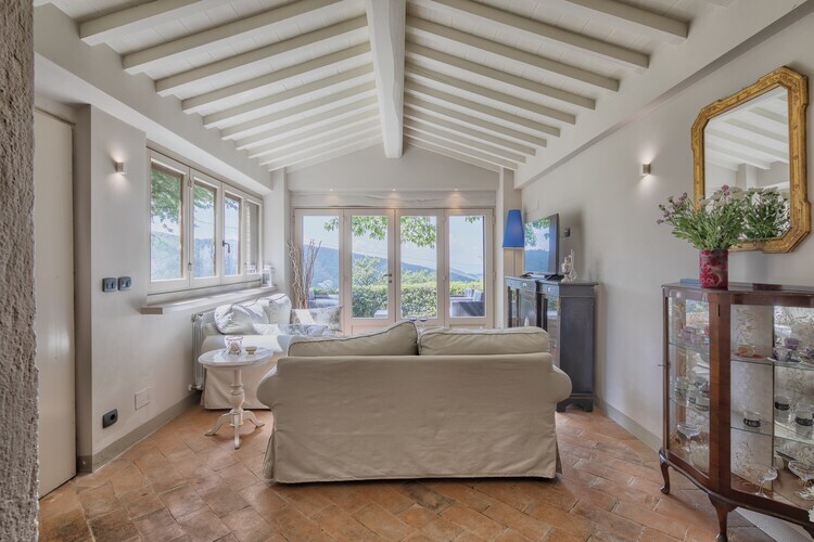 La villa a deux étages reliés par un escalier intérieur. Le salon est au rez de chaussée et a une vue sur la vallée et le jardin. Les intérieurs sont meublés avec goût et élégance.