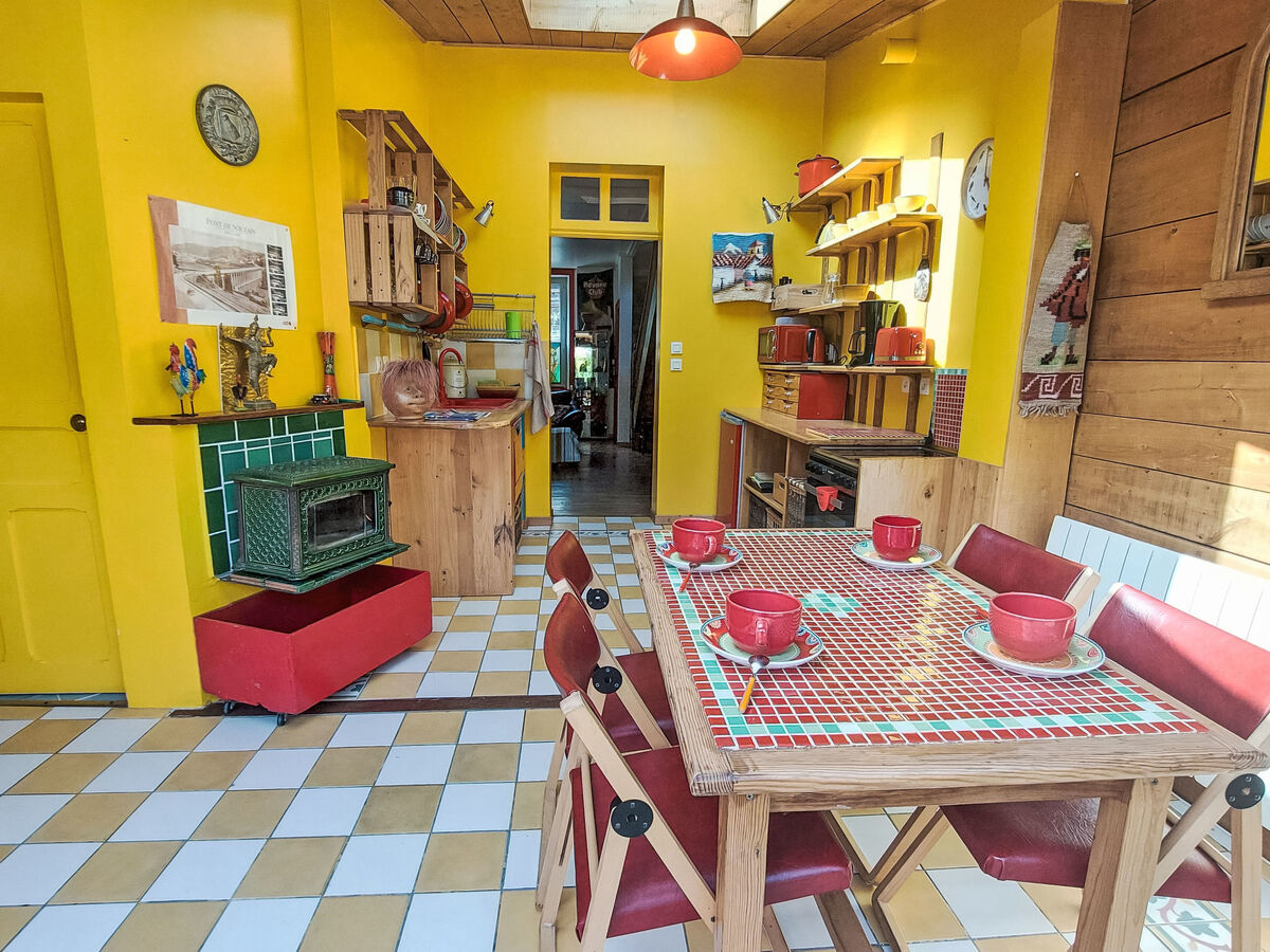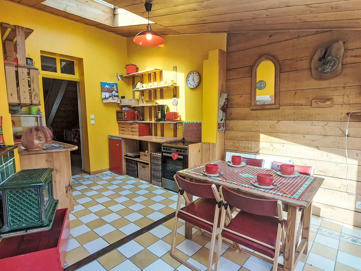 Petite cuisine ouverte (four, lave-vaisselle, 4 plaques à induction, grille-pain, bouilloire électrique, micro-ondes, congélateur, cafetière électrique) avec table pour les repas.