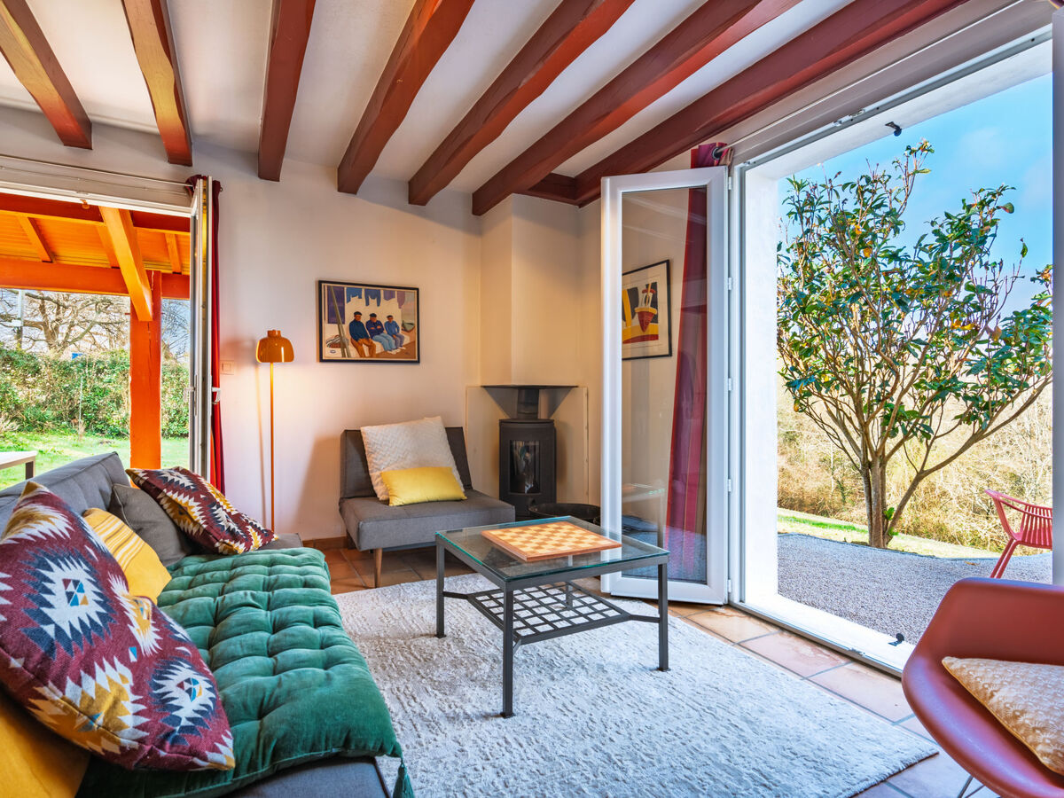 Aménagement fonctionnel et agréable: séjour/salle à manger avec TV (écran plat), radio, DVD et poêle à bois.