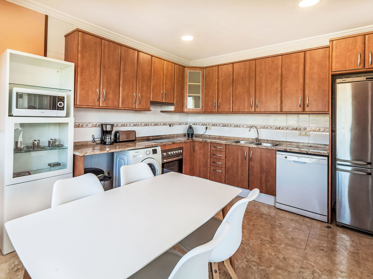 Grande cuisine (lave-vaisselle, 4 plaques vitrocéramiques, micro-ondes, congélateur, gril, cafetière électrique) avec table pour les repas.