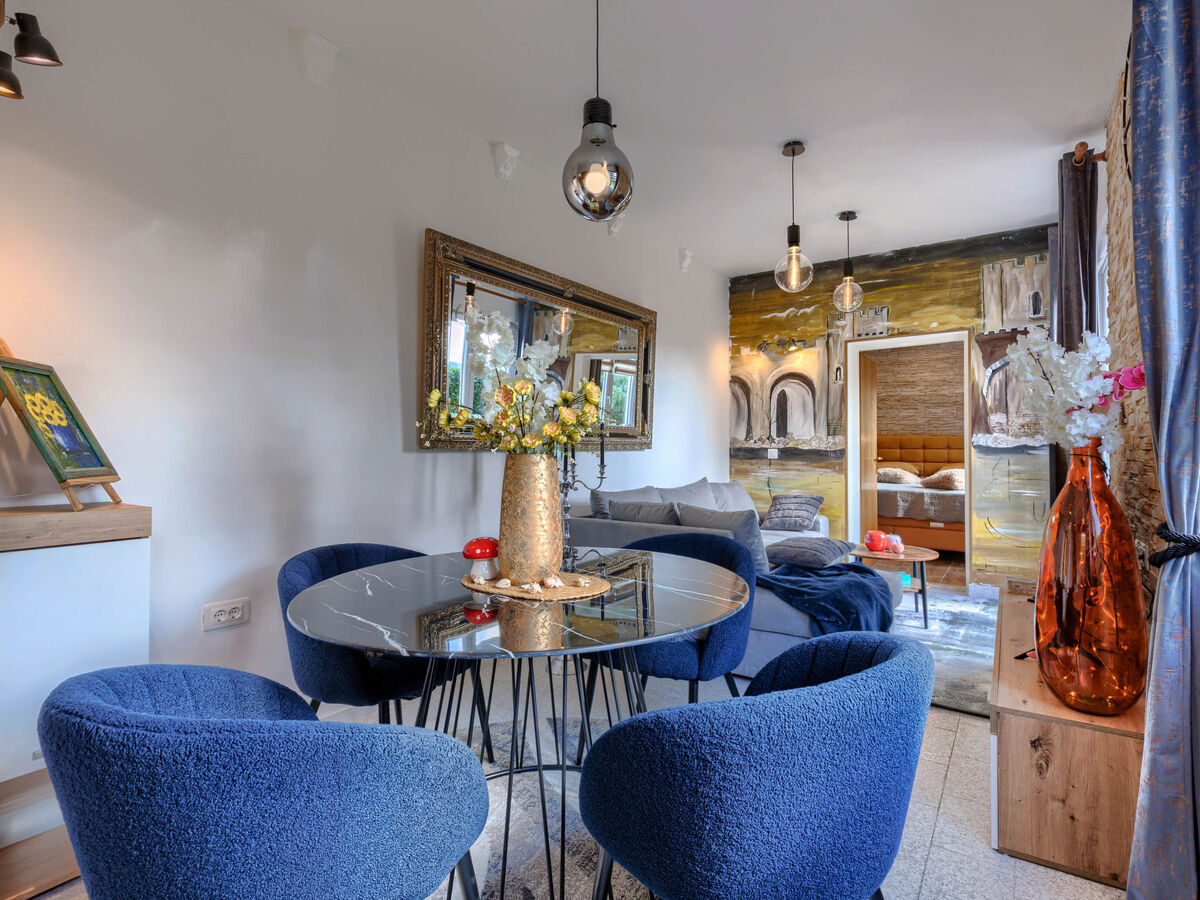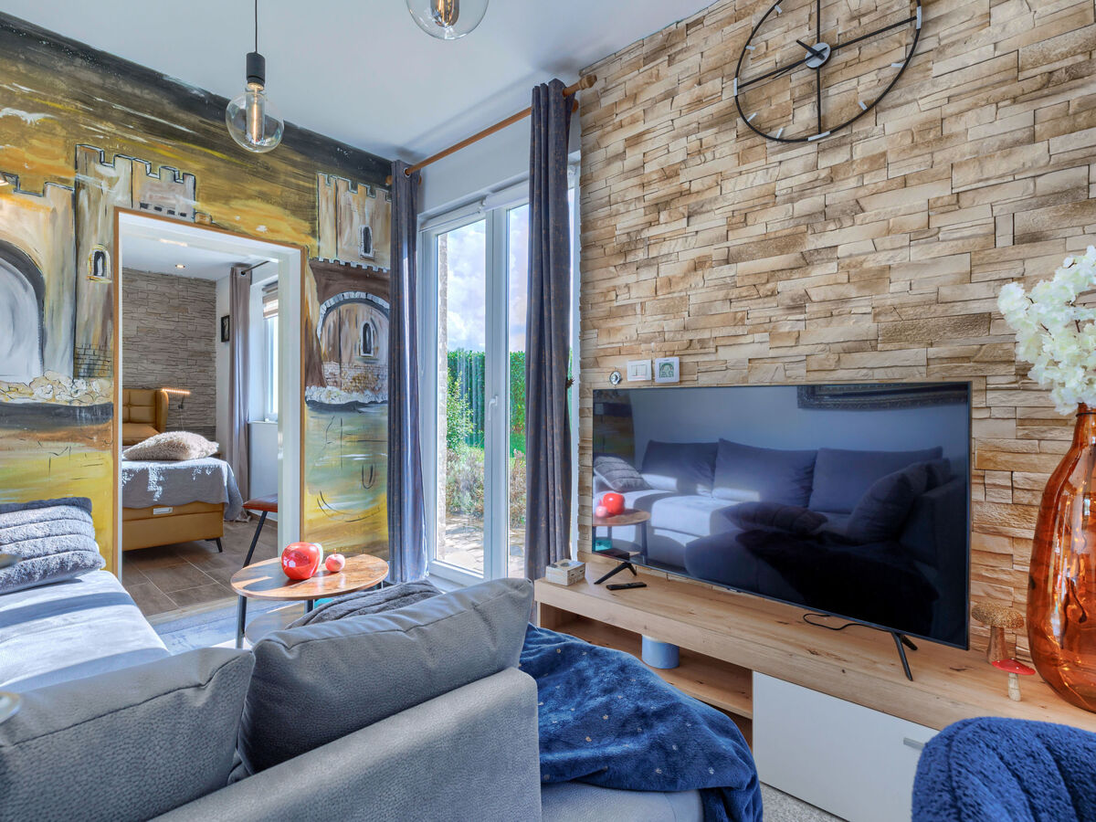 À l'étage supérieur: (escalier extérieur) séjour/salle à manger avec 1 divan-lit double (160 cm, longueur 200 cm), TV (satellite) (écran plat), poele de faience et air-conditionné.