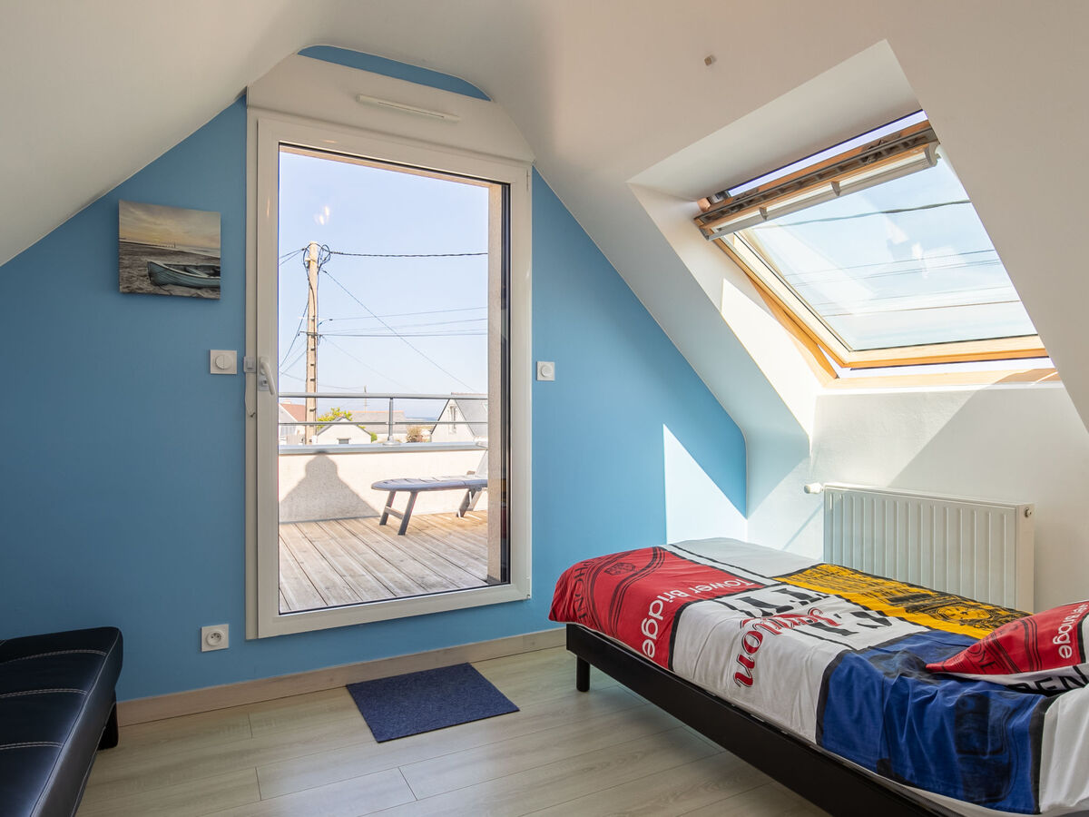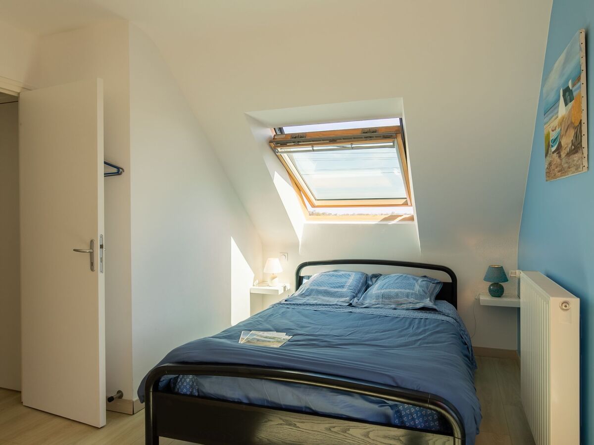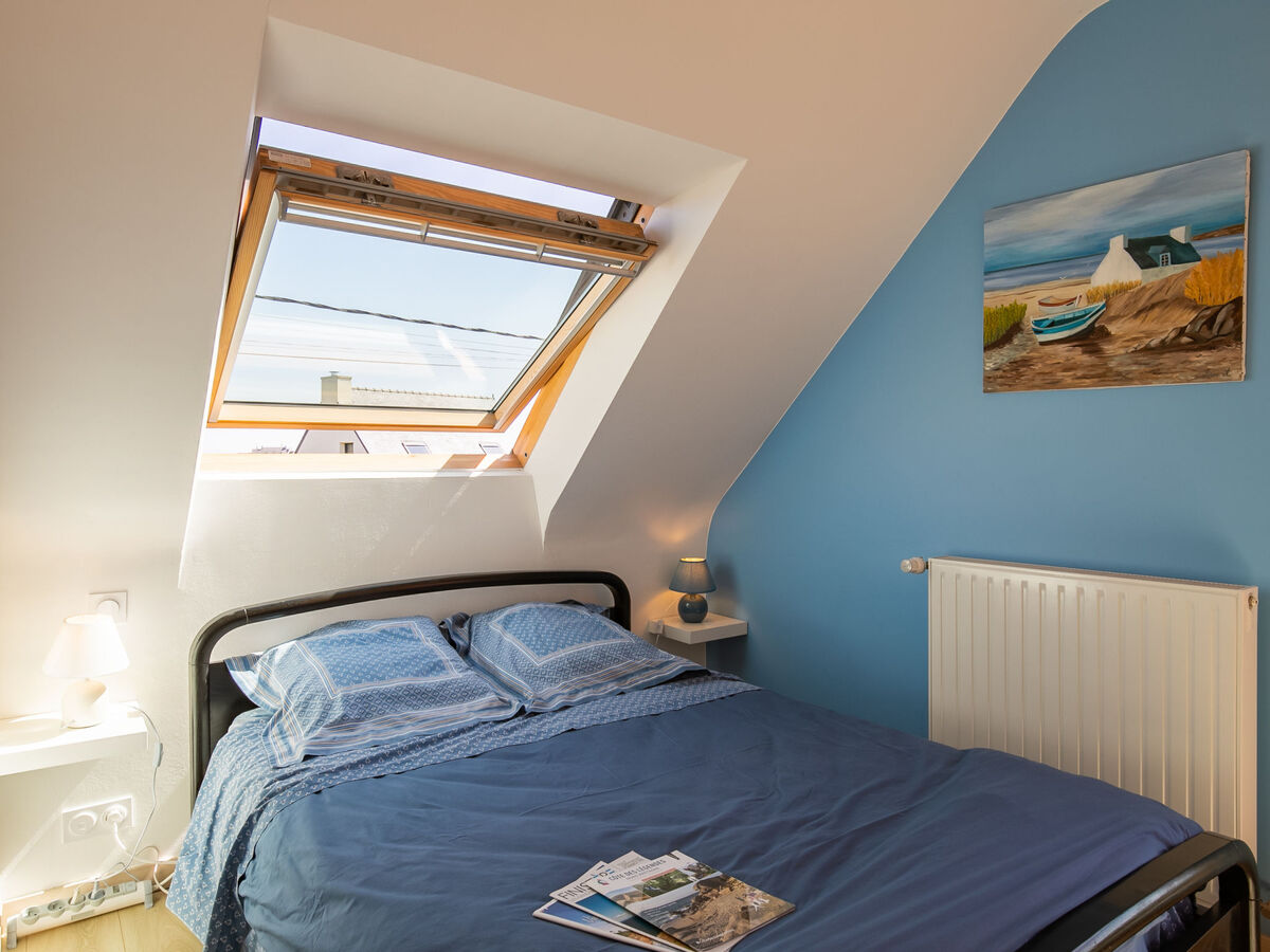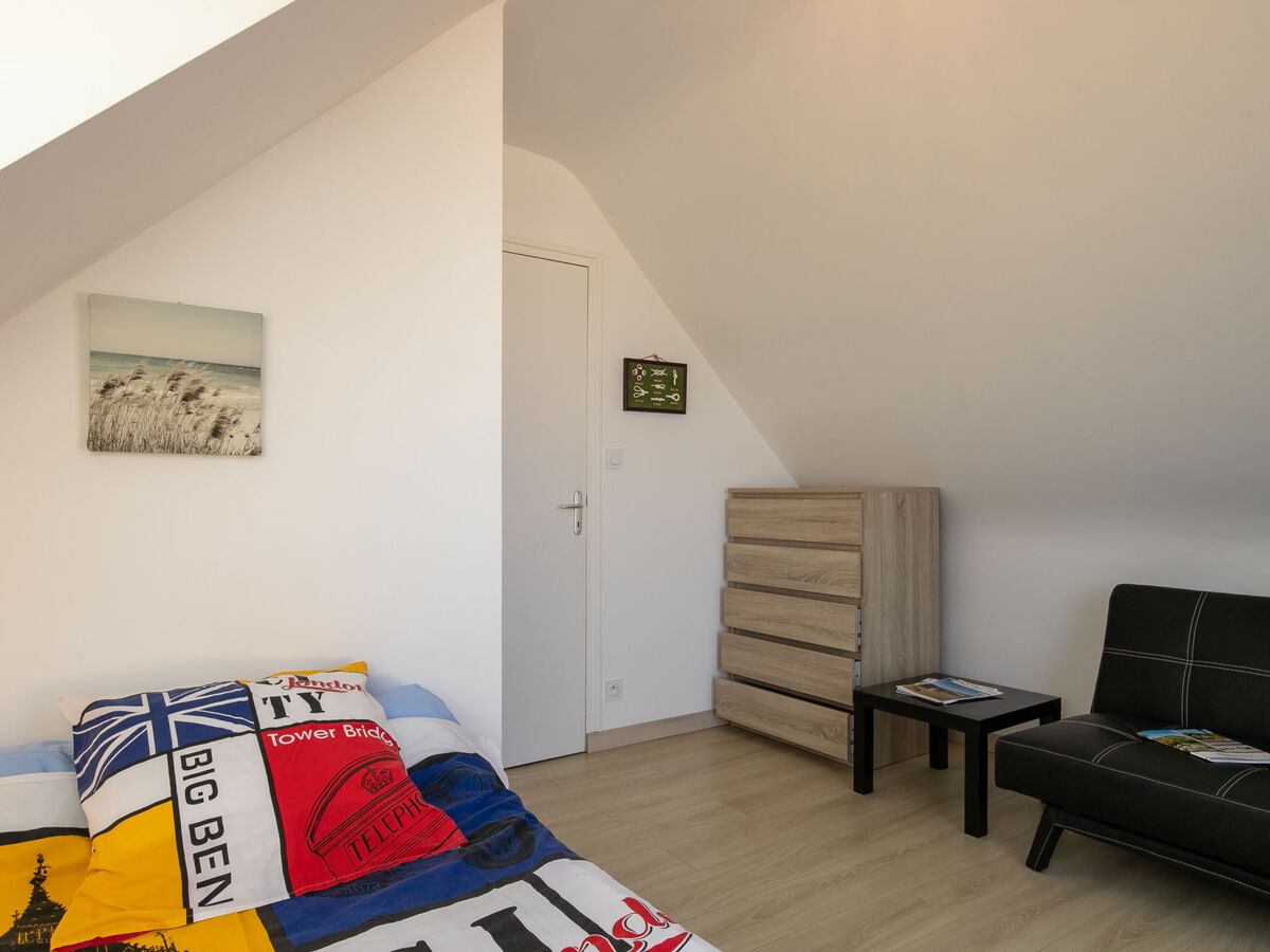 À l'étage supérieur: 1 chambre, mansardée avec 1 lit (90 cm, longueur 190 cm), 1 divan-lit (140 cm, longueur 190 cm).