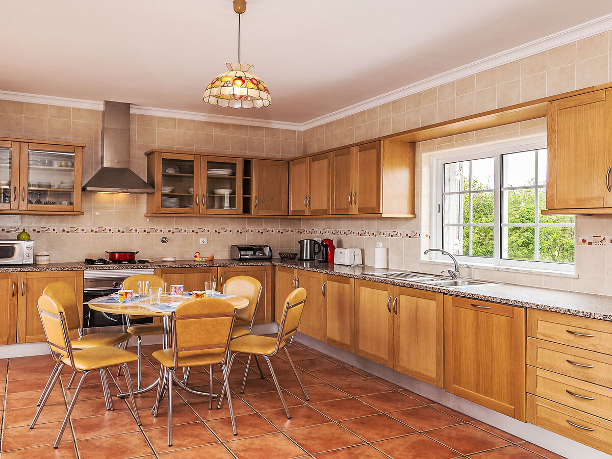 Cuisine (4 plaques de cuisson, four, lave-vaisselle, micro-ondes, congélateur, cafetière électrique, Capsules pour machine à café (Dolce Gusto) (NON INCLUSES)) avec table pour les repas.