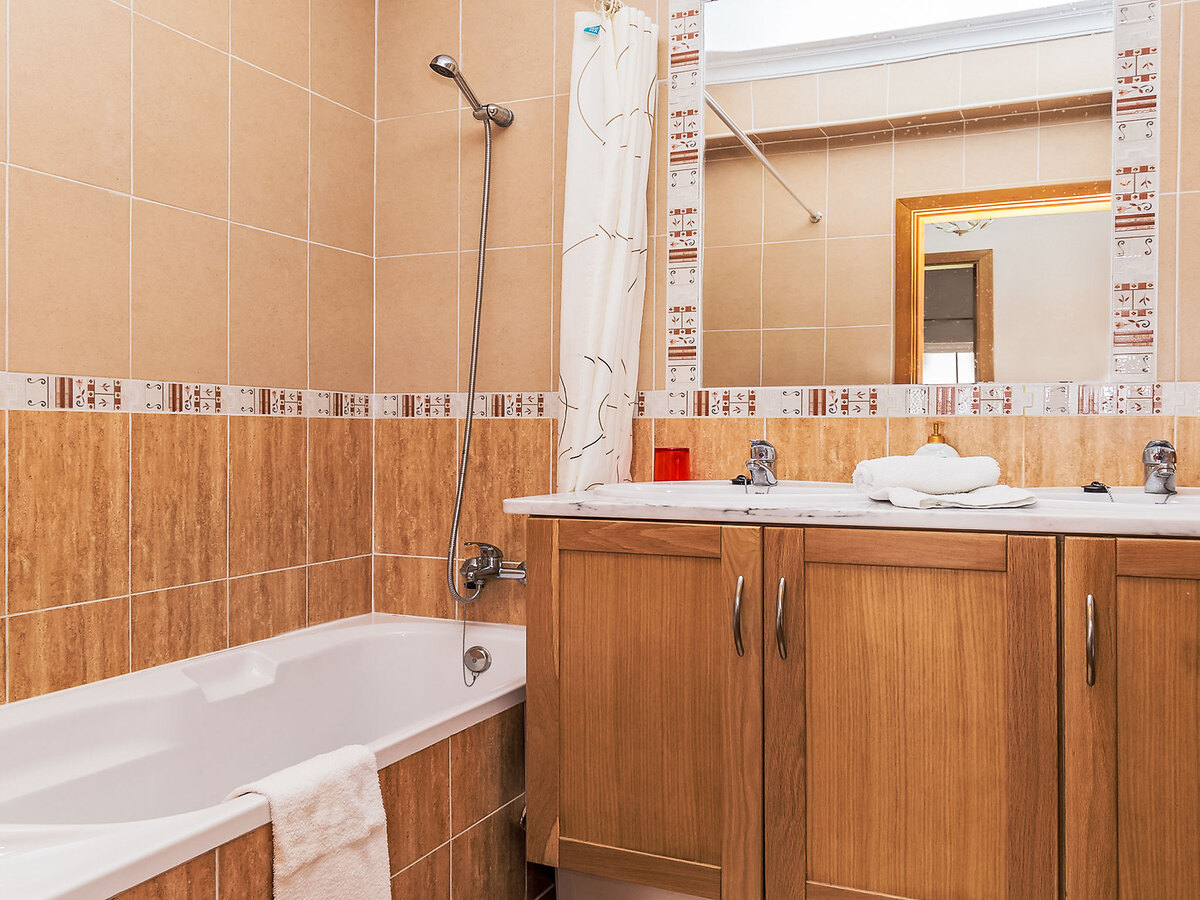 À l'étage supérieur: 1 chambre avec 2 lits (85 cm, longueur 185 cm), bain/douche/bidet/WC et double vasque.