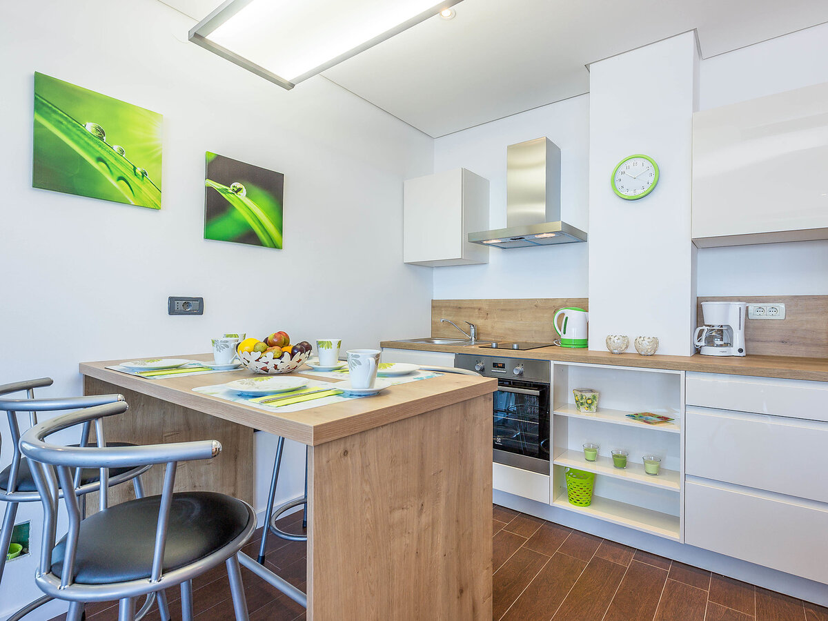 Cuisine ouverte (four, lave-vaisselle, 4 plaques vitrocéramiques, micro-ondes, congélateur, cafetière électrique).
