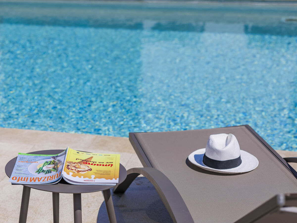 A usage privé: terrain 900 m2, beau jardin entretenu avec pelouse, piscine rectangulaire (9 x 4 m, profondeur 140 cm, disponibilité saisonnière: 01.Jan.