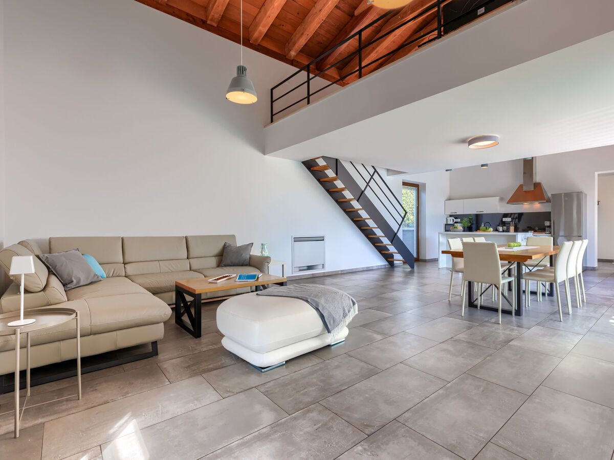 Cuisine ouverte (four, lave-vaisselle, 4 plaques à induction, micro-ondes, congélateur).