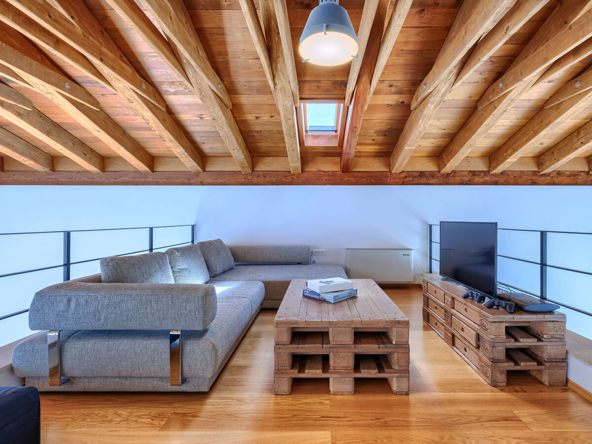 Galerie ouverte avec TV (satellite) (écran plat), chaîne stéréo et DVD.