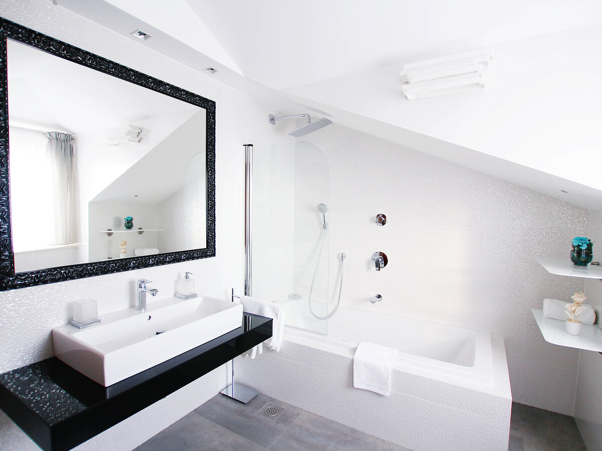 Sous le toit: 1 chambre, mansardée hauteur plafond 145 - 290 cm avec fenêtre sous le toit avec 1 lit double (2 x 90 cm, longueur 200 cm), douche/WC et TV (écran plat), air-conditionné.