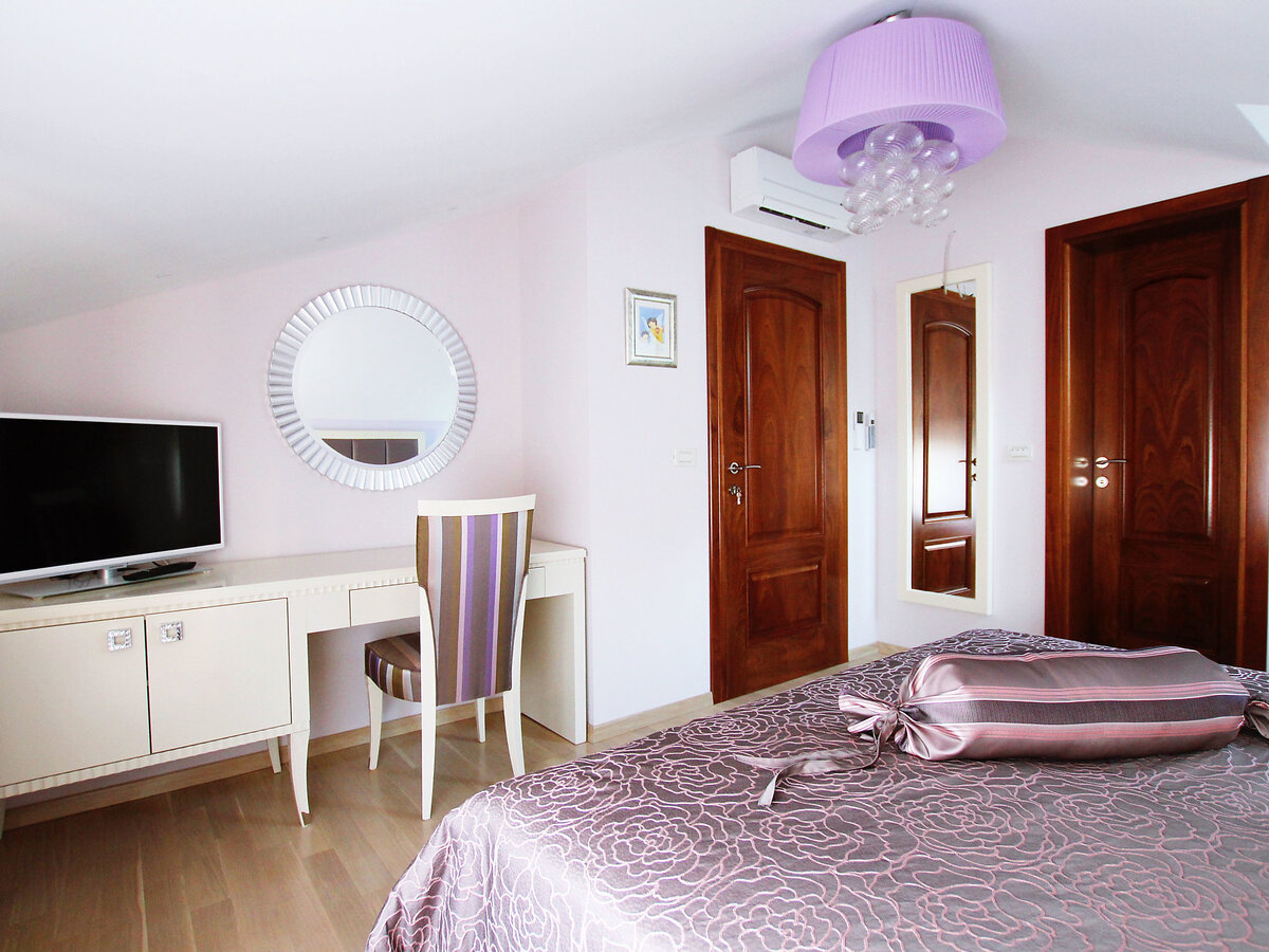 1 chambre, mansardée hauteur plafond 145 - 290 cm avec fenêtre sous le toit avec 1 lit double (2 x 90 cm, longueur 210 cm), bain/bidet/WC et air-conditionné.
