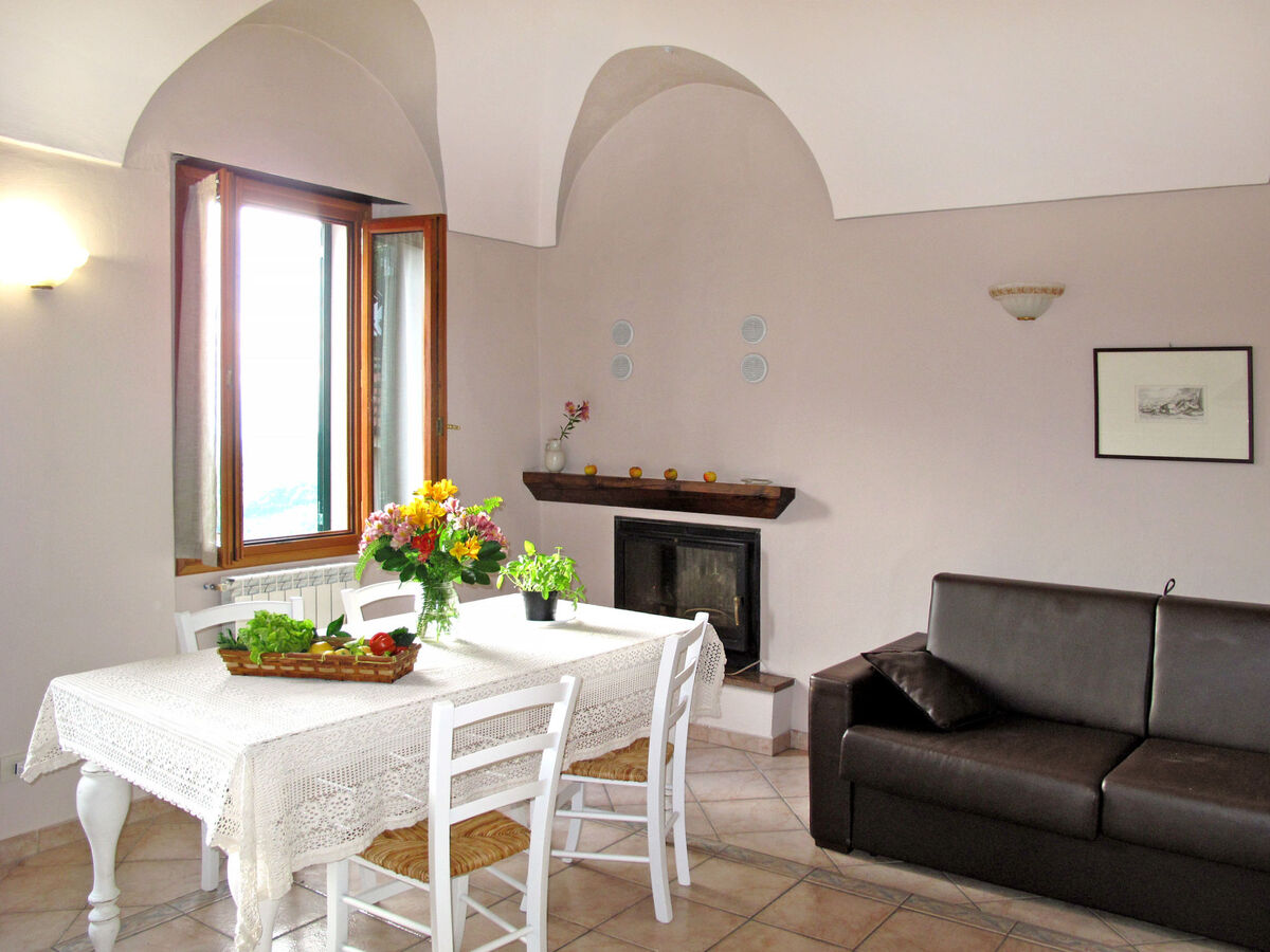 Clair, rénovée, aménagement fonctionnel: à l'étage supérieur: (escalier sans rampe) séjour/chambre à coucher avec 1 divan-lit double (140 cm), cheminée, table pour les repas, coin-cuisine et TV (satellite).