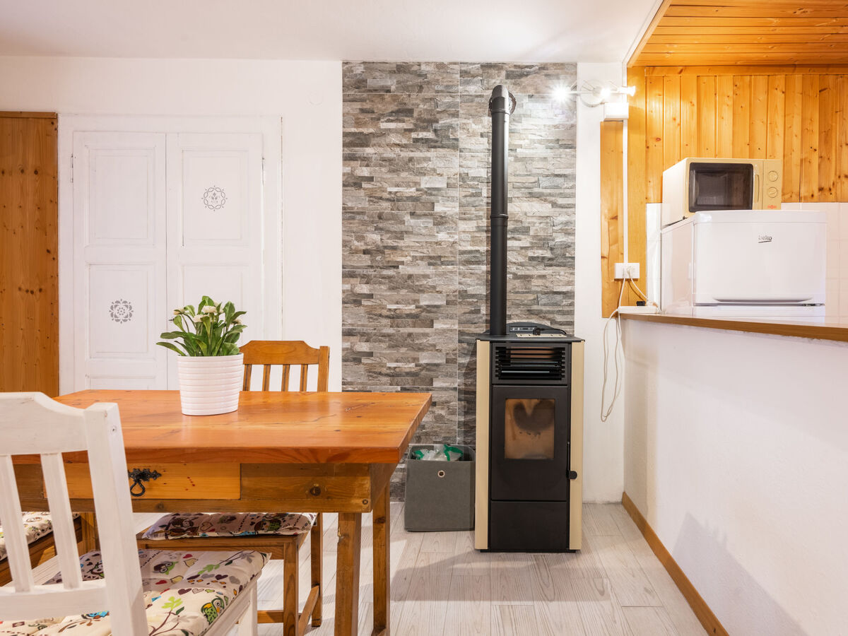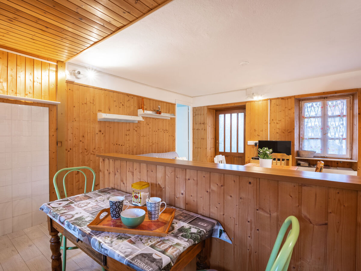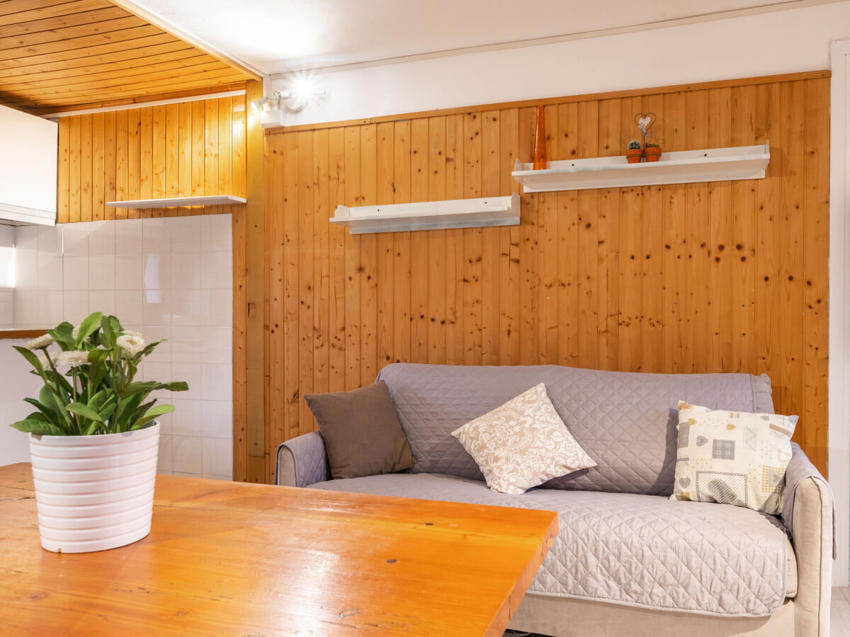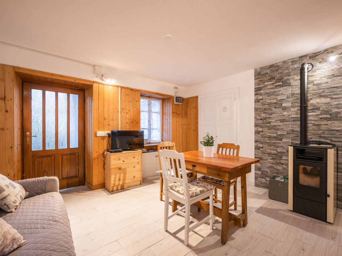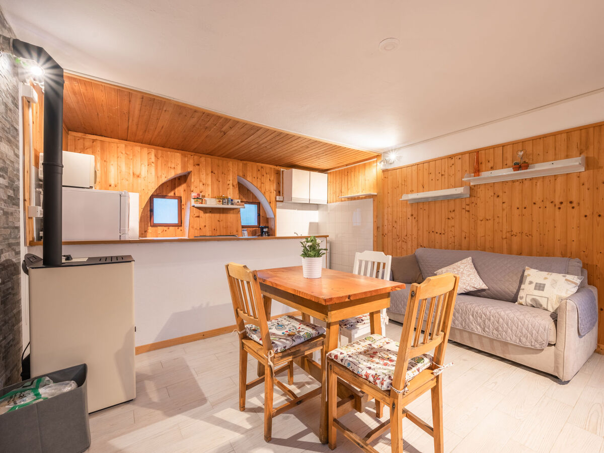 Rénovée en 2015, aménagement fonctionnel et rustique: séjour/chambre à coucher avec 1 divan-lit double, table pour les repas, TV (satellite) et radiateur.