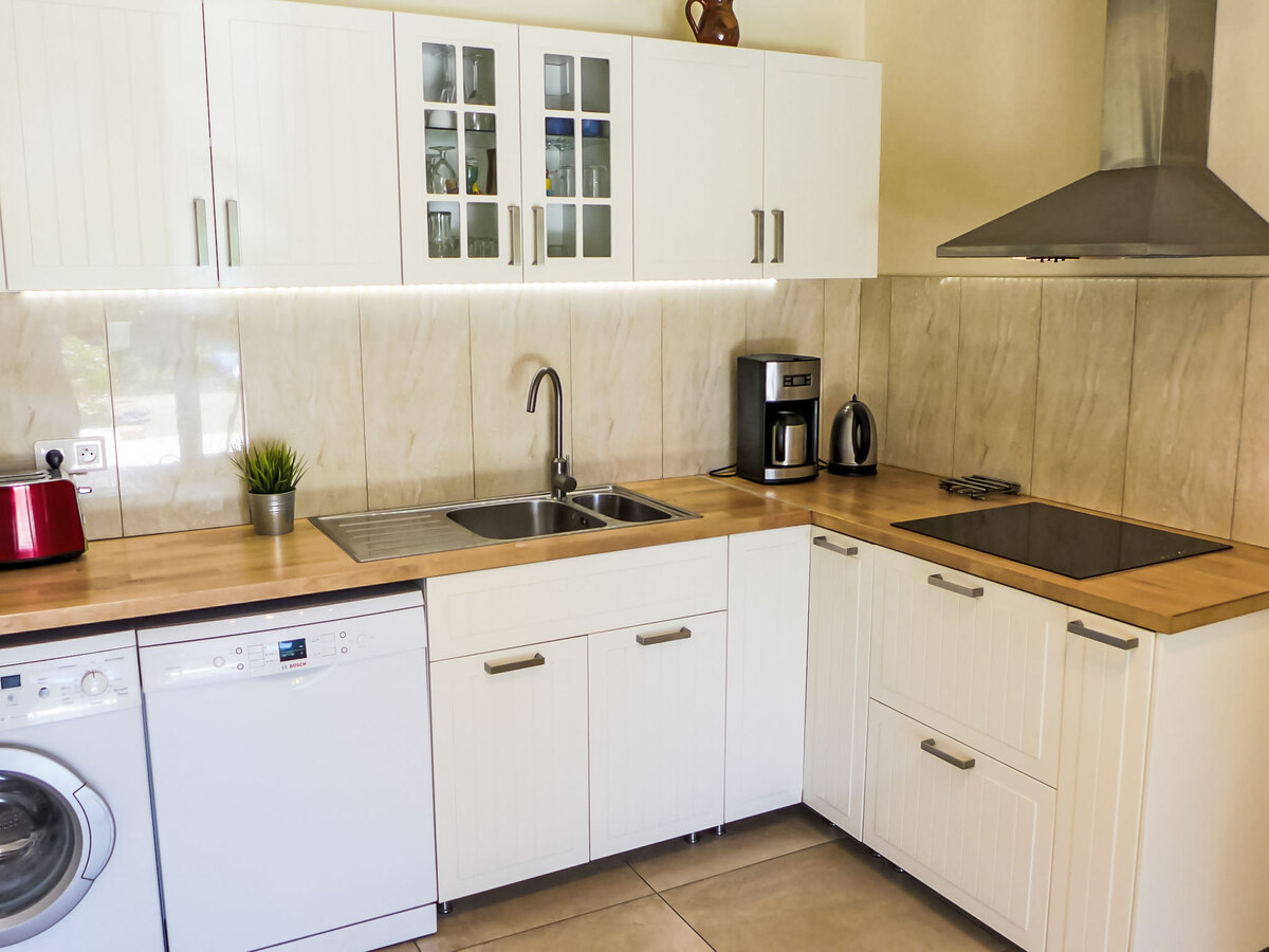 Cuisine (four, lave-vaisselle, 4 plaques à induction, grille-pain, bouilloire électrique, micro-ondes, cafetière électrique).
