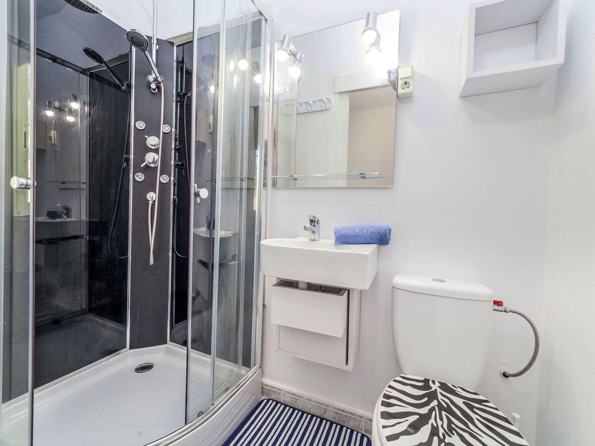 1 chambre double avec 1 grand-lit (140 cm, longueur 190 cm), lavabo et douche/bidet/WC.