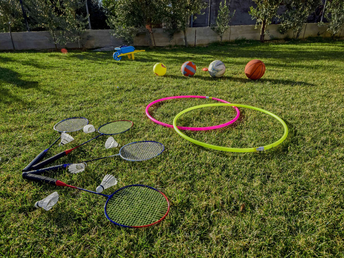 Douche extérieure, basket, terrasse (70 m2), meubles de jardin, espace barbecue, espace de jeux pour les enfants (toboggan, balançoire).