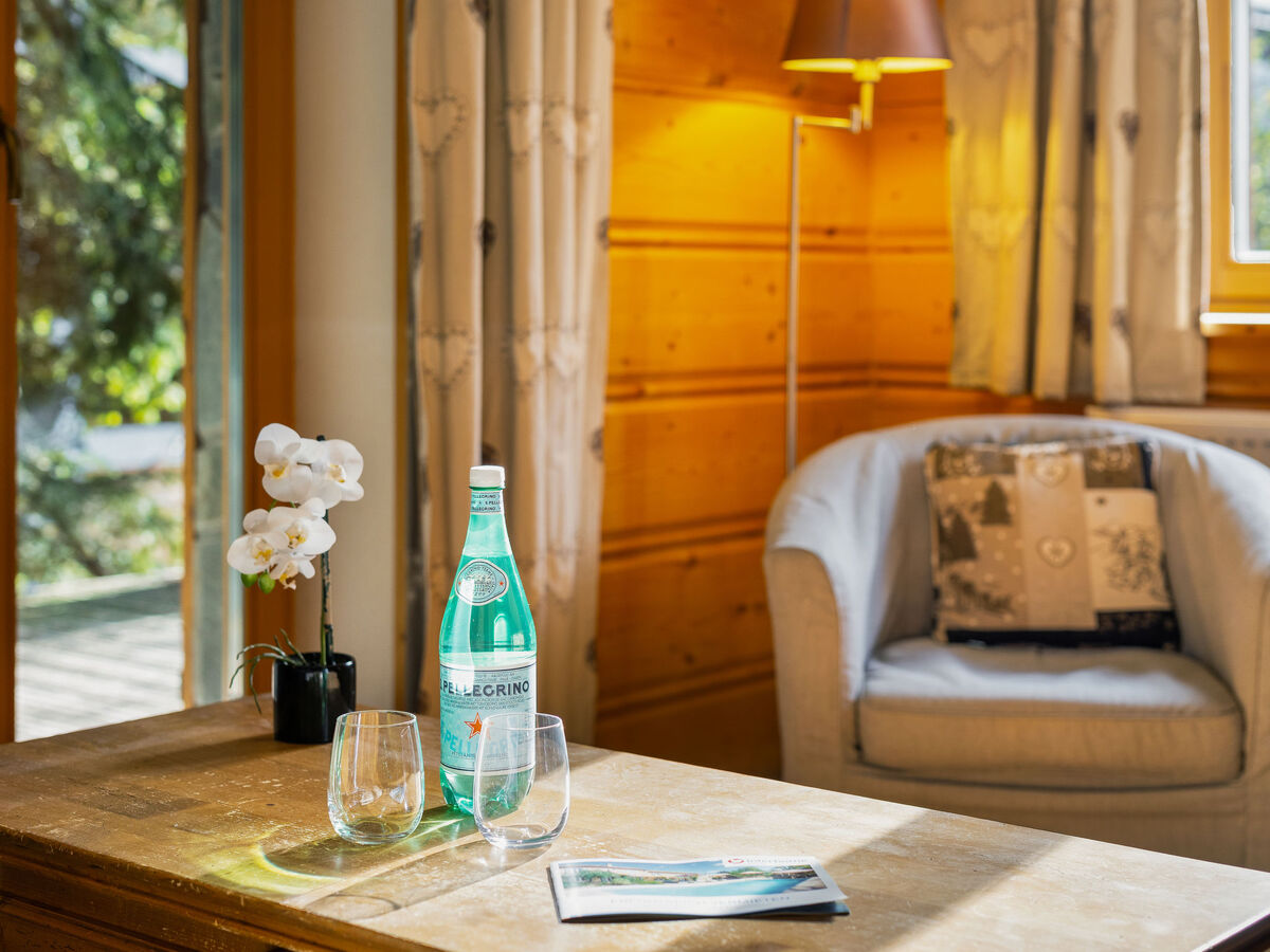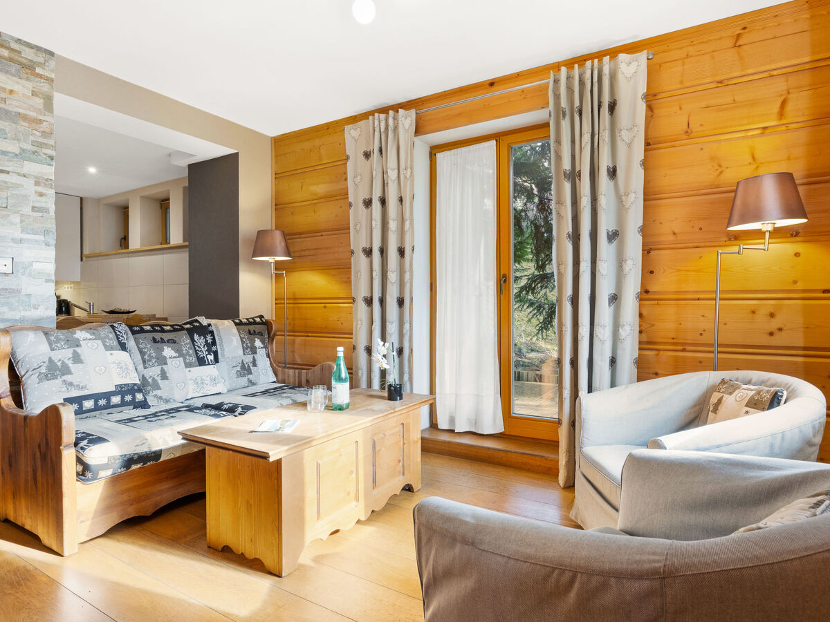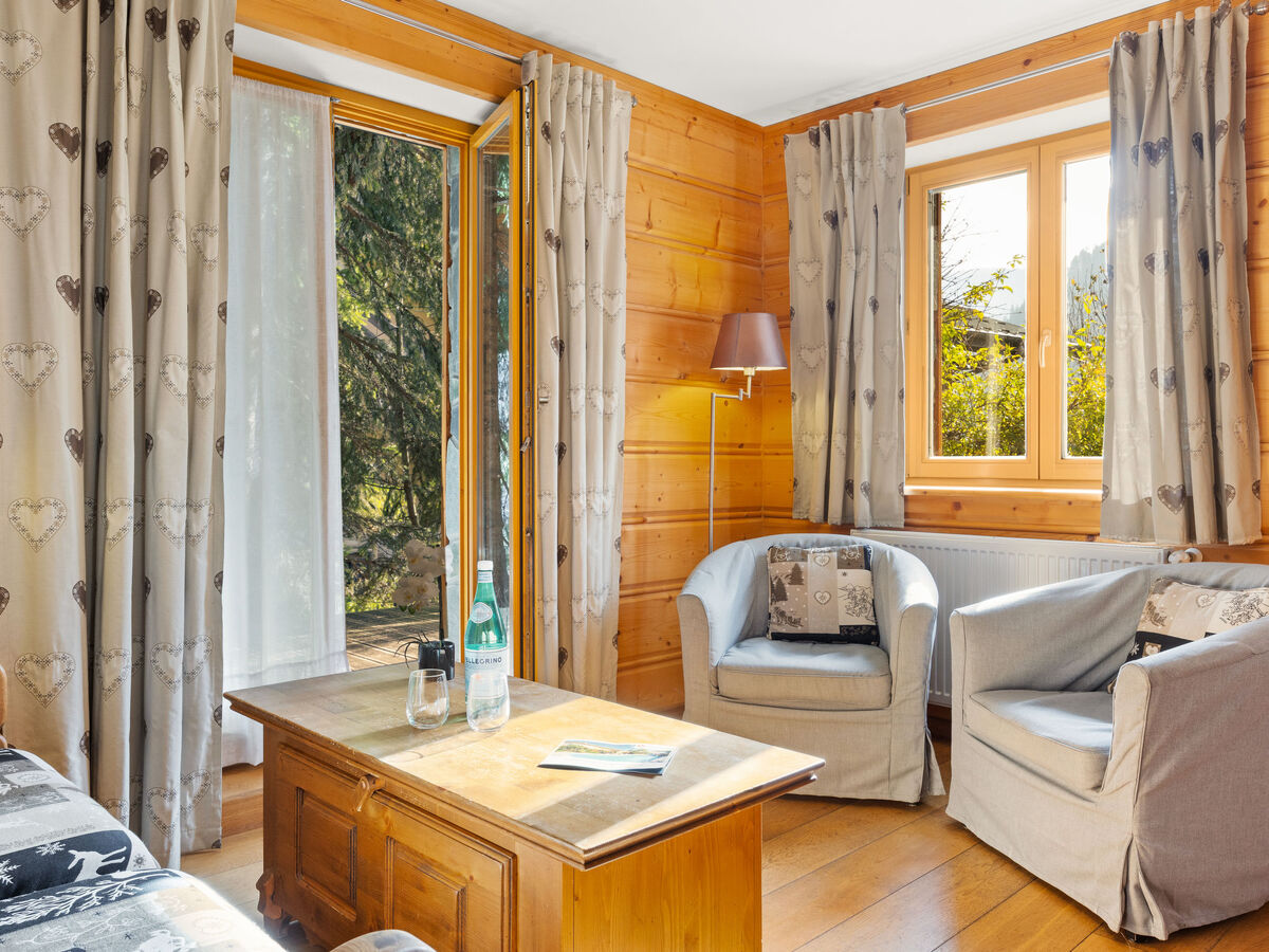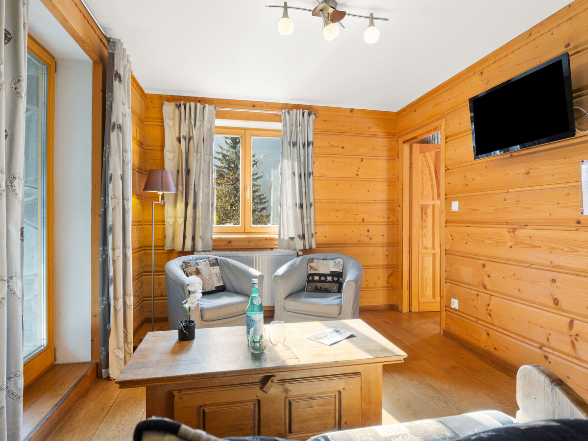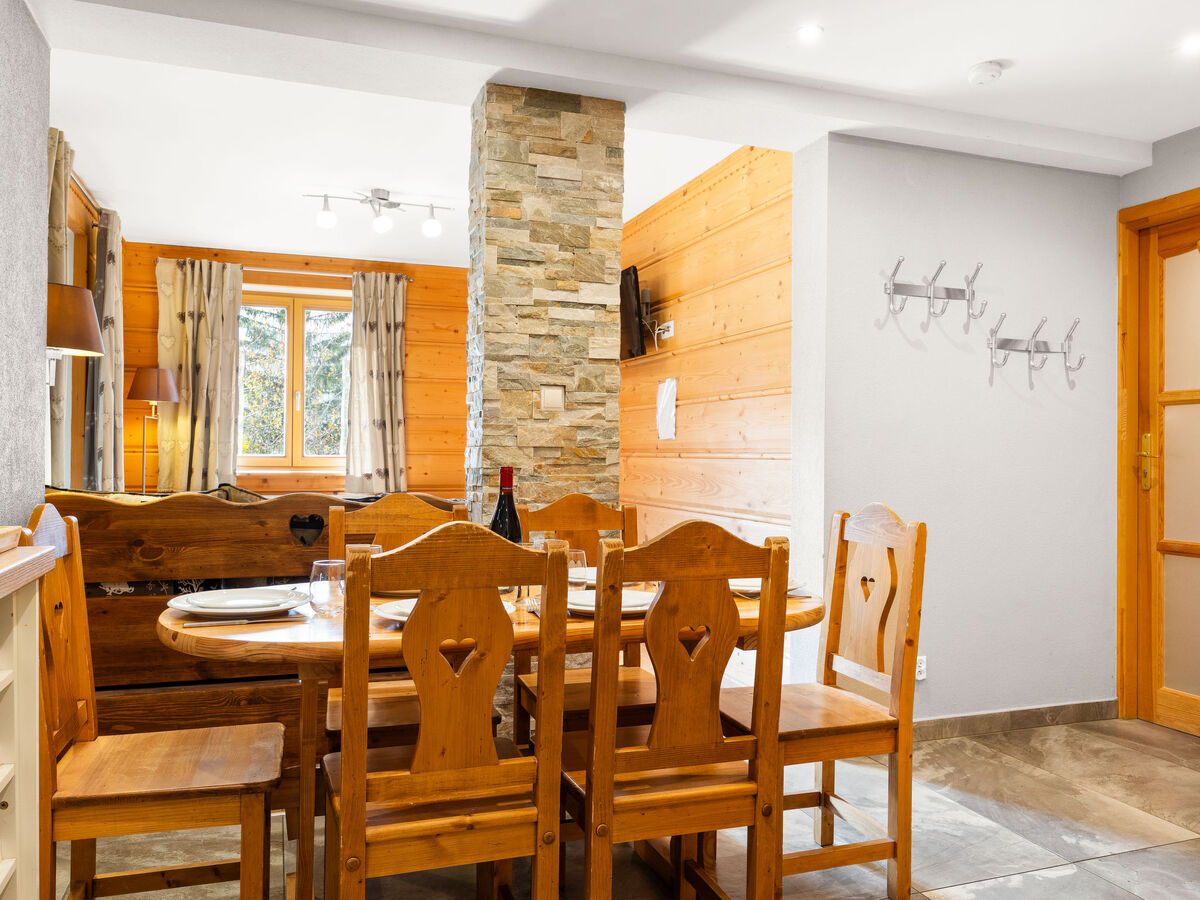 Rénové en 2015, aménagement plaisant et avec beaucoup de bois: séjour/salle à manger avec table pour les repas et TV (satellite).