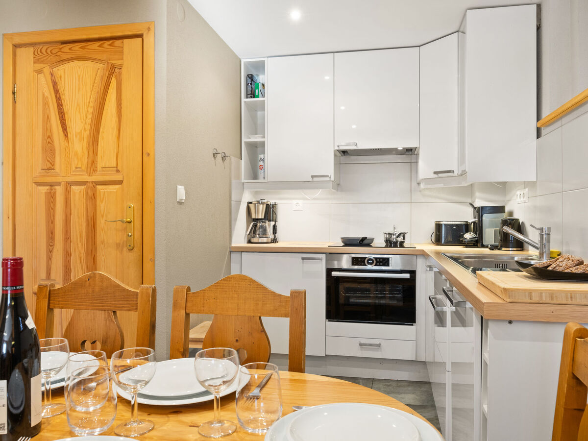 Cuisine ouverte (lave-vaisselle, 4 plaques à induction, grille-pain, bouilloire électrique, cafetière électrique, appareil à raclette, combiné micro-ondes) avec table pour les repas.