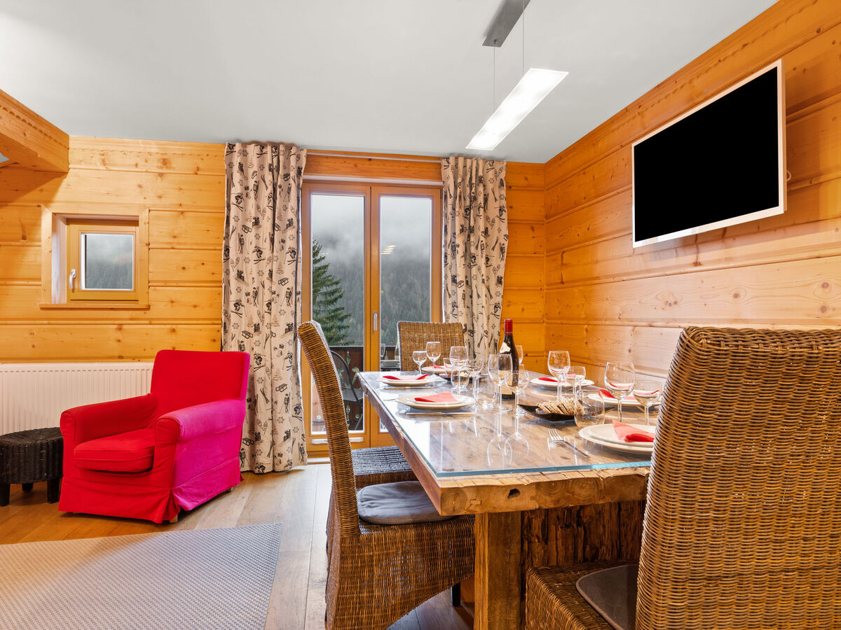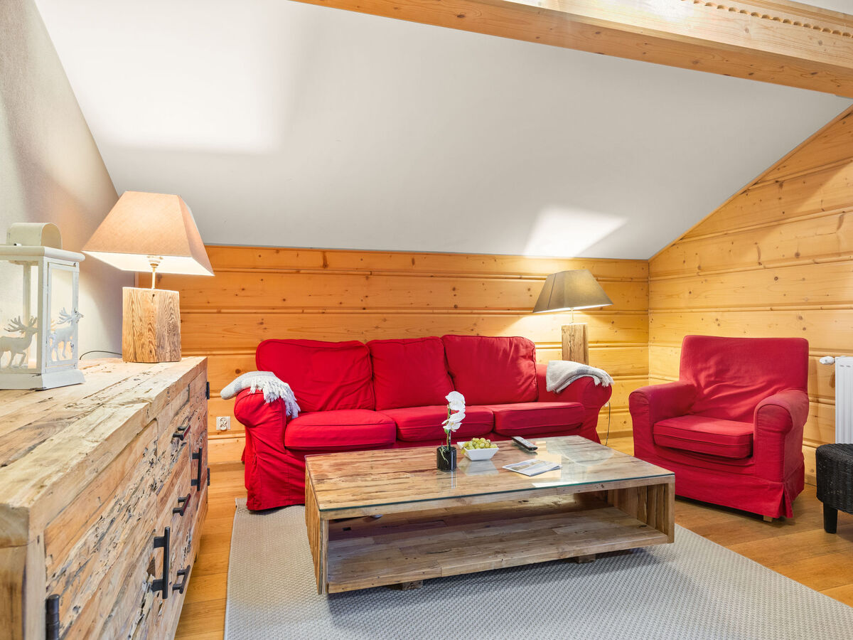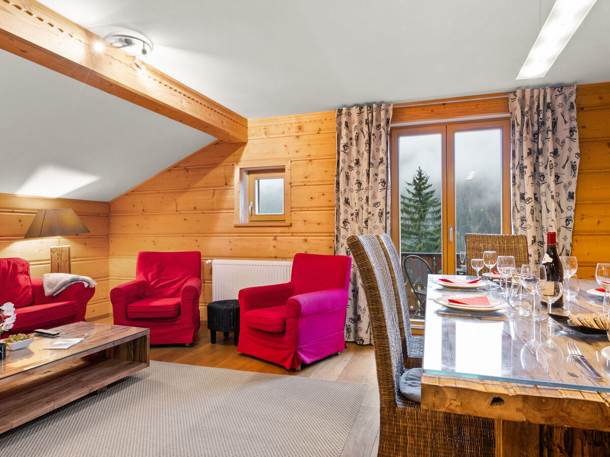 Mansardé, rénové en 2015, aménagement plaisant et avec beaucoup de bois: séjour/salle à manger avec table pour les repas et TV (satellite).