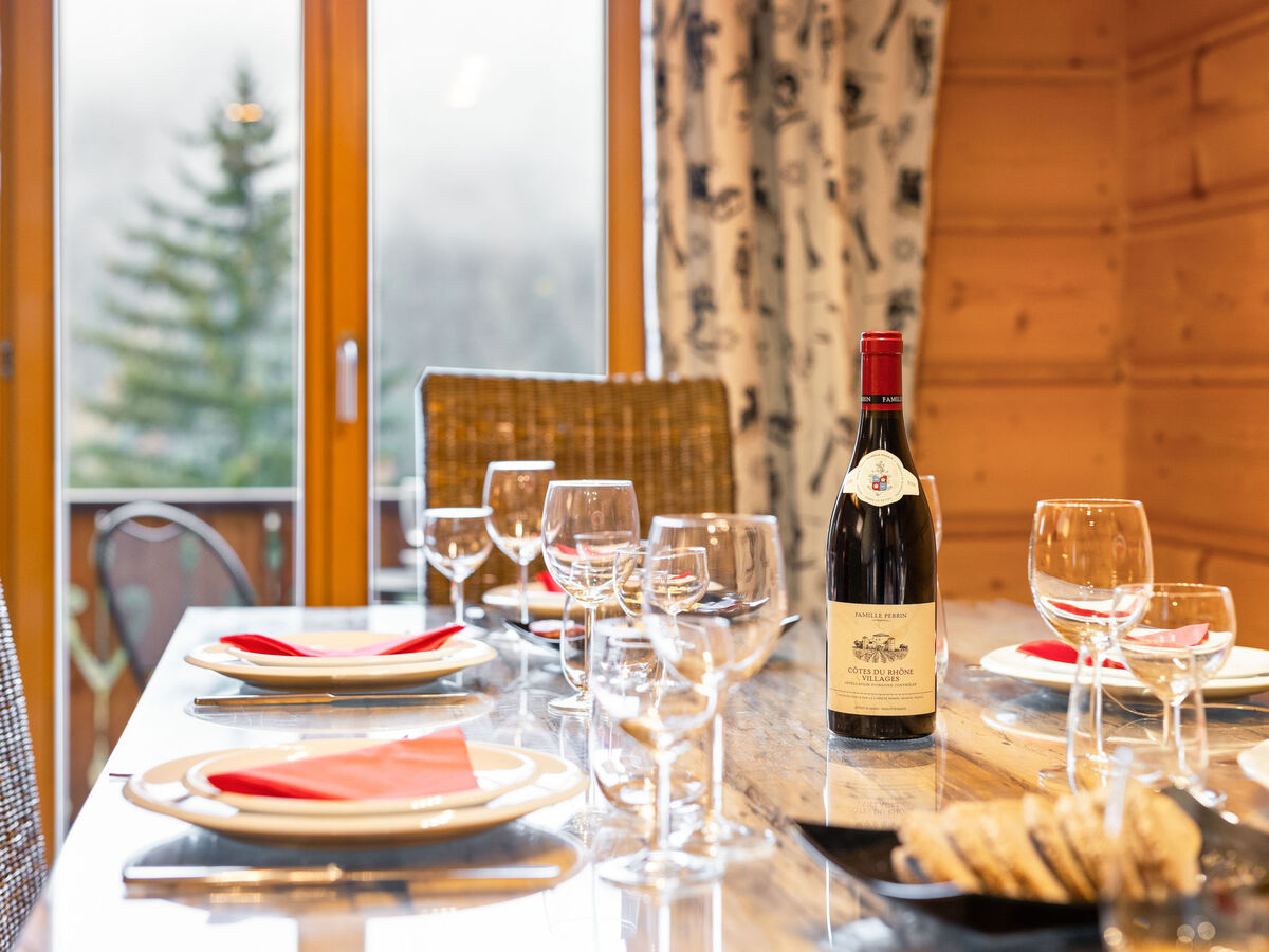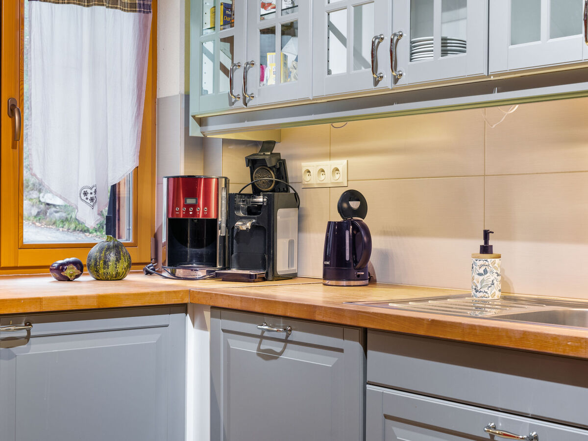 Cuisine (lave-vaisselle, 4 plaques à induction, grille-pain, bouilloire électrique, congélateur, cafetière électrique, appareil à raclette, combiné micro-ondes) avec table pour les repas.