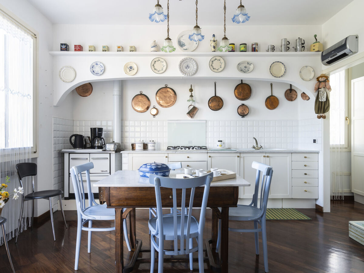 Cuisine (four, lave-vaisselle, 5 feux, grille-pain, bouilloire électrique, micro-ondes, congélateur, cafetière électrique) avec table pour les repas.