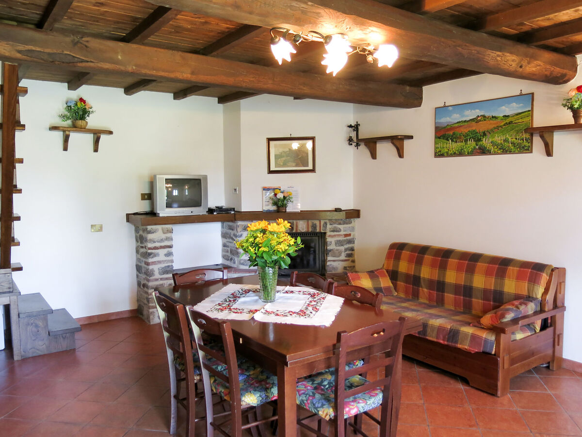 Rénovée, aménagement simple et rustique: séjour/chambre à coucher avec 1 divan-lit double, cheminée, table pour les repas et TV (satellite).